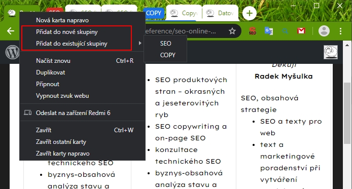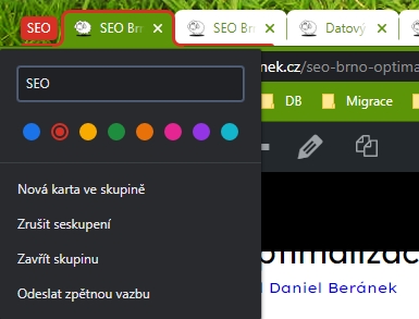 Jak používat skupiny panelů v Google Chrome?Skupiny panelů jsou okamžitě k použití, netřeba nic dalšího povolovat. Při kliknutí na ouško panelu se objeví možnosti: