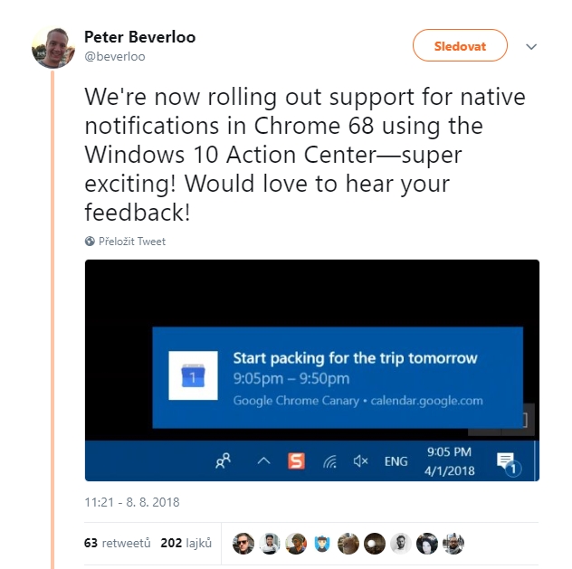 Google Chrome již delší dobu podporuje push notifikace od různých webů a webových aplikací, kterými se uživatelé mohou nechat informovat o nejnovějších zprávách, stejně jako o blížících se schůzkách či termínech dokončení úkolů. Začleněním notifikací Chromu konkrétně do Centra akcí přináší ty výhody, že uživatel bude mít k dispozici historii notifikací (notifikace Chromu jinak beznadějně mizí). A navíc budou tyto notifikace podléhat nastavení Pomocníka pro lepší soustředění a nebudou vás rušit uprostřed vyvrcholení akční scény filmu. Chrome tuto novinku zavedl potichu. Možná bychom si toho v těch vedrech ani nevšimli, nebýt tweetu Petera Beverlooa z vývojového týmu Chrome: „Právě jsme implementovali podporu nativních notifikací v Chrome 68 pro Centrum akcí Windows 10 - což je super bomba! Už se těšíme na vaše reakce!“ Funkce je navíc uvolňována postupně - zatím ji má jen padesát procent uživatelů Chrome v. 58. Ať už tedy nativní notifikace v systému ze strany aplikace Google Chrome zapnout či vypnout: