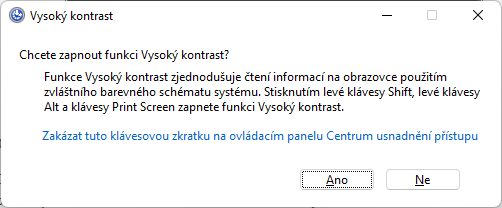 Jak zapnout funkci Vysoký kontrast pomocí klávesové zkratky?Stiskněte kombinaci kláves levý SHIFT + levý ALT + PRINT SCREEN, což vyvolá obrazovku, jejíž potvrzení zapne poslední z použitých režimů vysokého kontrastu. Jak zapnout režimy vysokého kontrastu z Průzkumníka souborů?