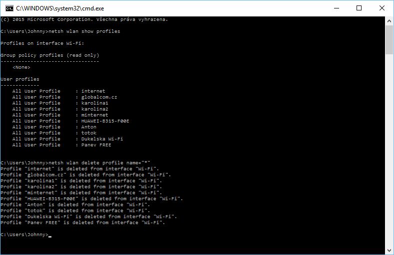 Jste-li příznivci razantních změn, všechna podstatná hesla si pamatujete, neradi necháváte stopy apod., můžete odebrat seznam Wi-Fi sítí komplet pomocí příkazové řádky: