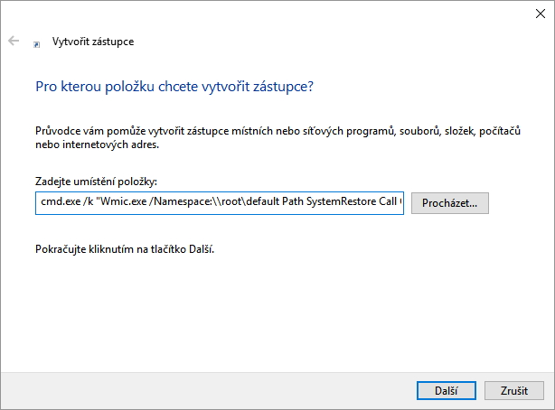Bod obnovy na jeden klik si vytvoříme pomocí příkazového řádku, resp. přes zástupce s příkazem na něj: