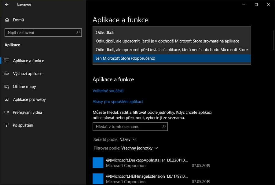 Omezení instalace aplikací podle zdrojů původu (tedy oddělení těch, které pocházejí a které nepocházejí z obchodu Microsoft Store) provedeme pomocí systémové aplikace Nastavení: