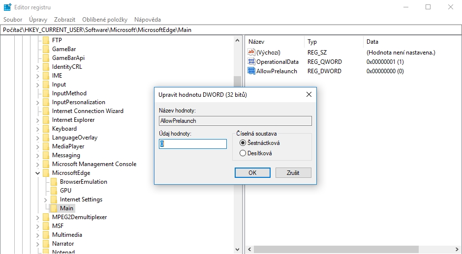 Pokud budete chtít přednačítání Microsoft Edge povolit, opětovně zamiřte do systémového registru na umístění HKEY_CURRENT_USER\Software\Policies\Microsoft\MicrosoftEdge\Main a Údaj hodnoty nastavte na 1 či položku AllowPrelaunch zcela smažte. Zrušení přednačítání Microsoft Edge pro všechny uživatelePostup je stejný, jen je třeba být k Windows přihlášen pod účtem s právy administrátora: