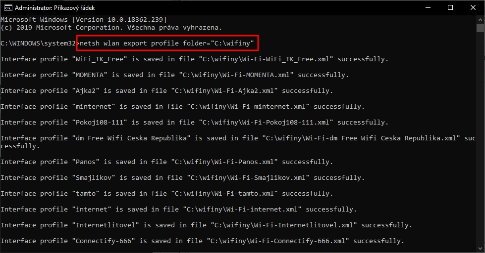 Jak zálohovat Wi-Fi profilyK záloze profilů Wi-Fi sítí využijeme Příkazový řádek a příkaz netsh: