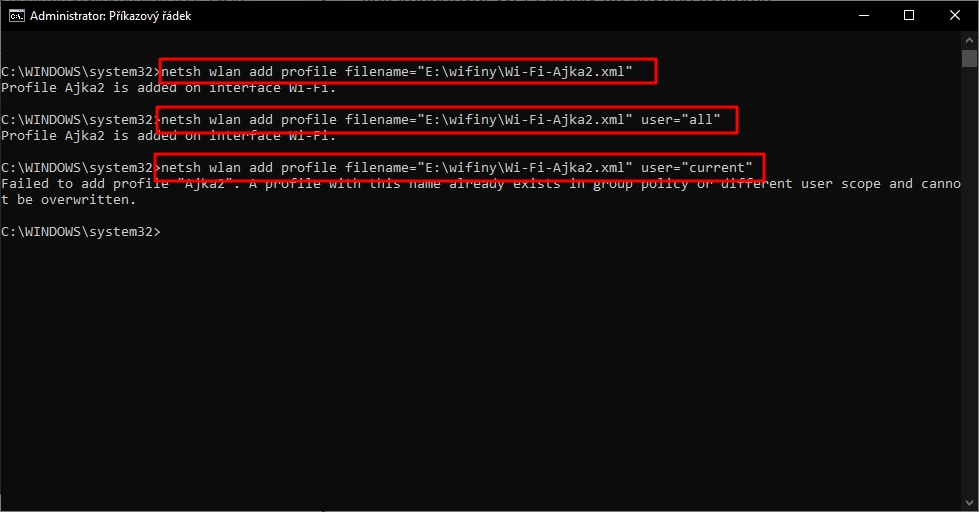 V tento moment máme vyexportovány profily Wi-Fi sítí do požadovaného umístění v podobě XML souborů, jejichž strukturu přibližuje obrázek výše. Složku profilů můžeme zálohovat lokálně, komprimovat, zálohovat do cloudu či přenést pomocí flashky do nového zařízení, které chceme vybavit získanými profily Wi-Fi sítí. Jak importovat Wi-Fi profily do nového systémuZálohované profily lze snadno zkopírovat na flashku a naimportovat do nového zařízení a jeho systému. Opět k tomu využijeme Příkazový řádek a příkaz netsh: