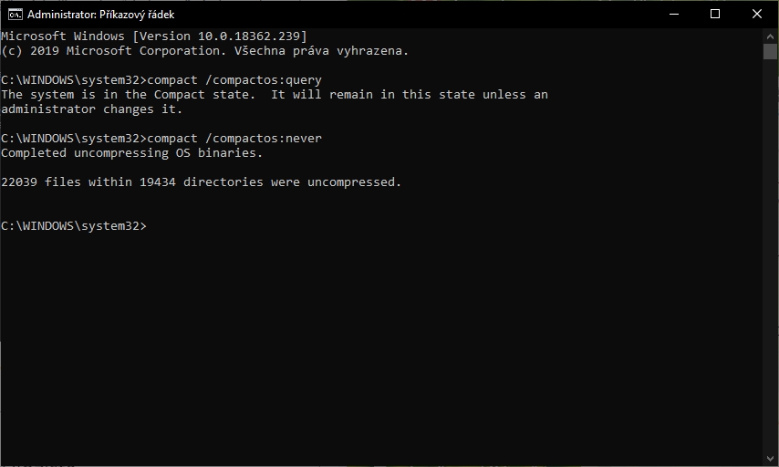 Vypnutí komprese systémových souborů Windows 10Pokud máte dostatek diskového prostoru a chcete vyzkoušet, zda bude Windows pracovat rychleji bez nutnosti práce s komprimovanými soubory, můžete kompresi zajištěnou funkcí CompactOS vypnout: