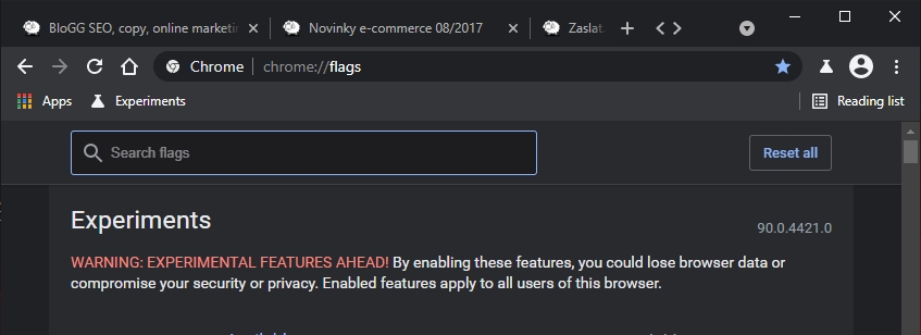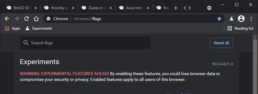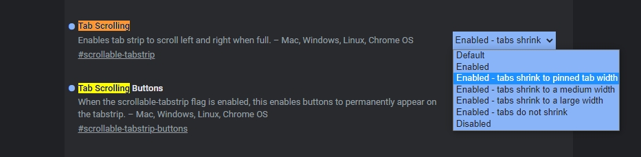 Jak se zvětšuje množství otevřených panelů v Google Chrome, zmenšuje se velikost jejich oušek. Ovšem při funkci scrollování mezi otevřenými panely můžeme určit, až na jakou velikost se tato ouška budou zmenšovat. Díky scrollování mezi těmito oušky totiž nemusíme jejich velikost zmenšovat vůbec, a tak zachovat informační hodnotu popisu ouška panelu. Funkce je zatím experimentální. Nachází se ve vývojářské větvi prohlížeče Google Chrome Canary, a to sice od vývojové verze 90.0.4415.0. Jak určit šířku scrollovatelných oušek panelů v Google Chrome?