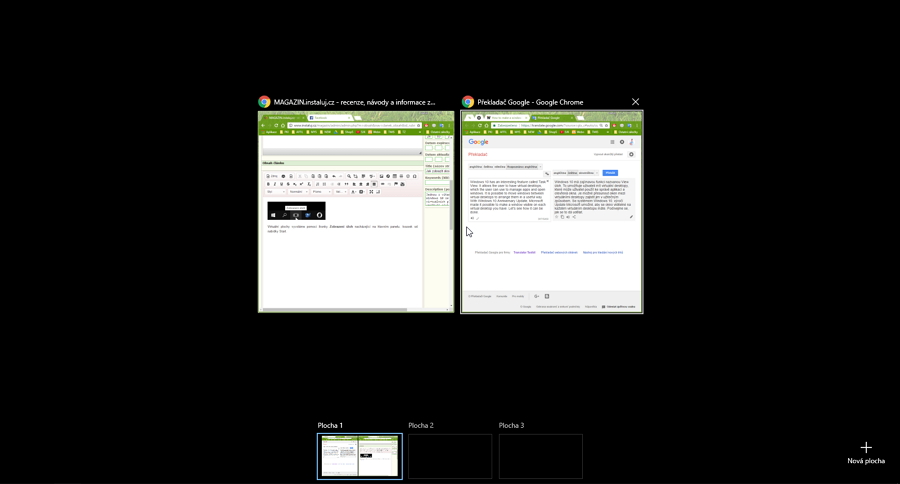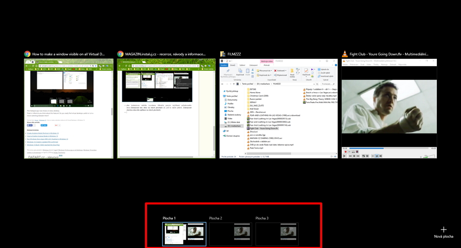 Virtuální plochy vyvoláme pomocí ikonky Zobrazení úloh nacházející na hlavním panelu, kousek od nabídky Start. Alternativou je použití klávesové zkratky Win + Tab. Zobrazení úloh nám přehledně ukáže jednak aktivitu na aktuální ploše v prostoru nahoře a jednak všechny dostupné virtuální plochy, včetně náčrtu aktivity na nich. Chceme-li jedno okno (a tedy i jednu instance daného programu) vidět na všech virtuálních plochách: