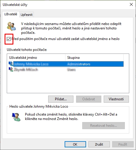 Vypnutí hesla přes Uživatelské účtyVypnutí potřeby zadat uživatelské jméno a heslo najdeme ve správě uživatelských účtů. Proto postupujeme: