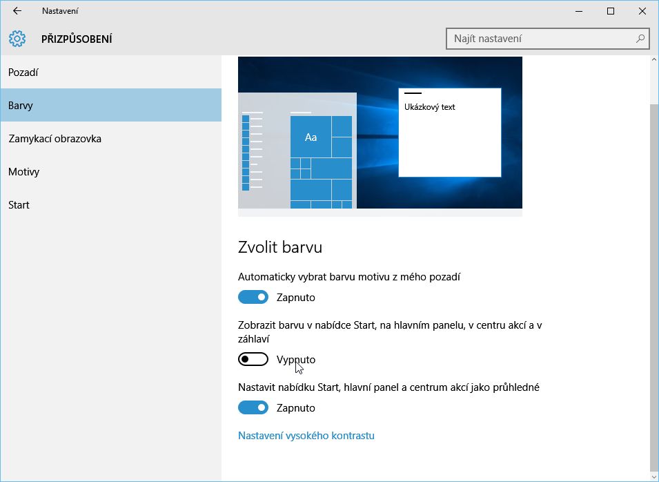 Nejprve je třeba vůbec mít průhlednost prvků povolenou. Navigujeme proto do Nastavení - Přizpůsobení - Barvy, kde zkontrolujeme, zda je položka Nastavit nabídku Start, hlavní panel a centrum akcí jako průhledné zapnuta. Abychom plně ocenili změnu průhlednosti, je vhodné vypnout prostřední položku, tedy zobrazení automaticky zvolené barvy z motivu, která je jinak aplikována právě na tyto prvky. Dále tedy upravíme registr: