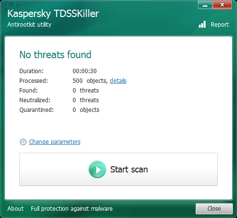 Po specifikaci voleb a jejich potvrzení OK se vracíme na obrazovka Ready to scan a můžeme začít skenovat. Rootkity jsou programy či programové balíky, které mají za úkol skrýt přítomnost malwaru v systému. Windowsovské rootkity se probourávají do systému a narušují systémové funkcionality (např. aplikační prostředí Windows API). Mají tendenci instalovat vlastní služby a ovladače, které taktéž skrývají, a i jejich pomocí skrývat nově vytvářené složky, programy, zápisy do registru a procesy generované malwarem. Detekce rootkitů bývá obtížná, neboť často infiltrují činnost právě těch programů, které by je měly odhalit. Identifikovány bývají většinou za použití jiného operačního systému (jako jsou např. záchranné verze operačních systémů nabízených vývojáři bezpečnostních produktů), behaviorálně orientovanými metodami, ověřováním digitálních podpisů veškerého nainstalovaného softwaru či analýzou výpisů paměti. Rootkity patří k obzvláště zákeřnému malwaru a jejich odstranění bývá složité - zejména v případech, kdy se usídlí v kernelu systému. Pak často nezbývá než systém přeinstalovat. Ještě horší průběh má infikace firmwaru hardwaru, kterou lze buď vyčistit vysoce specializovanými nástroji, nebo vůbec. Pak je třeba hardware kompletně vyměnit. Analýza celého systému je velmi rychlá - většinou trvá do minuty. Při troše štěstí se nám dostane výsledku No threats found. V případech méně šťastných se objeví výpis nalezených hrozeb, jejich popis, umístění, rizikovost a možné operace: Skip, Cure, Delete. Kaspersky TDSSKiller souhrnemKaspersky TDSSKiller by si měl poradit s rootkity, bootkity napadajícími MBR a větví malwaru odvozeného od Rootkit.Win32.TDSS. Je vybaven jednoduchým grafickým rozhraním, které nás snadno provede celým procesem analýzy rootkitů. Lze ho spustit i v bezpečnostním módu systému. Pracuje rychle a velice efektivně - má totiž přístup do neustále aktualizované databáze hrozeb Kaspersky Security Network. S TDSSKiller si snadno porozumí i uživatel nekompatibilní s angličtinou díky velmi návodnému provedení programu.