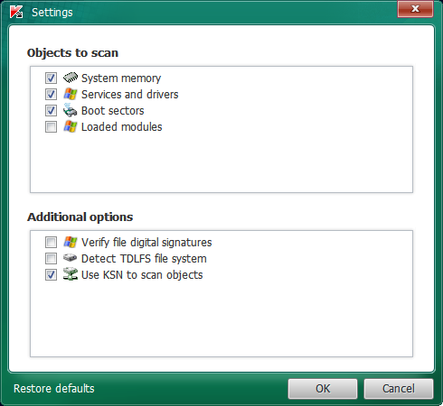 Kaspersky TDSSKiller je portable program - netřeba ho tedy instalovat. Po spuštění je třeba pouze odsouhlasit licenční podmínky a prohlášení týkající se Kaspersky Security Network. Poté již je program připraven k použití. Ještě můžeme upravit nastavení utilitky pod Change parameters, kde najdeme: