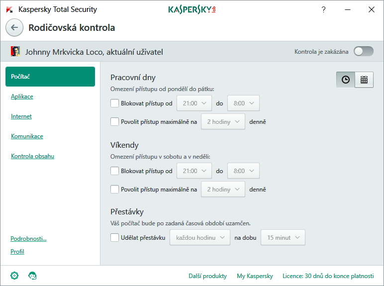 Produkty laboratoří Kaspersky jsou vyspělé nejen technicky, ale za nemalou dobu svého pobytu na trhu i uživatelsky. Instalace je proto prostá - zahrnuje ovšem zřetelné přihlášení do služby Kaspersky Security Network, která sice na jednu stranu nabízí zvýšení ochrany cloudovou komponentou - na stranu druhou je přesně tím choulostivým momentem, který mnoho uživatelů nerado spouští. Po výběru se balík rovnou instaluje. Nechce po uživateli upřesnit umístění v systému. Rovnou míří do C:\Program Files(x86). Po instalaci se rovnou spustí - inicializuje průvodce, který uživatele v rychlosti provede základními funkcemi bezpečnostního balíku Kaspersky Total Security. A na závěr se ještě instalátor uživatele zeptá, zda chce spustit ochranu instalací proti reklamám, díky níž by se jakékoliv další instalace měly obejít bez zanášení systému adwarem. V aplikaci nás vítá opět o něco čistší rozhraní ve smyslu komunikace funkcí a snadnosti jejich ovládání. Hned na úvod nám Total Security nabízí několik doporučení, které krom obligátní aktivace placené verze zahrnují aktualizaci programu a jeho databází a návrh doinstalace parciálních funkčních komponent, jako jsou rodičovská kontrola, heslová klíčenka, bezpečné zálohy a další. KontrolaPoložka obsahuje testy systémů na vyžádání. Jejich podání je obvyklé - tedy: rychlý (v řádu několika minut), úplný (kol hodiny) a selektivní. Zvlášť je vypíchnuta Kontrola externích zařízení, která se po vložení přenosných médií inicializuje sama. Kontrola zahrnuje i plánovač kontrol, který nabízí spuštění rychlé, úplné a selektivní kontroly v různých časových frekvencích. Ostatní možnosti podmínění chybí. Ochrana financíOchrana financí je dnes už poměrně rozšířený modul nabízející spuštění chráněného prohlížeče pro zprostředkování veškerých finančních transakcí a jiných citlivých komunikací. Weby do chráněného prohlížeče může zadat sám uživatel, nebo jejich zahrnutí nabídne sama aplikace automaticky. Detekce finančních webů ovšem není stoprocentní. V rozhraní se pak vybere, zda se má rovnou spustit chráněný browser, má se dát vybrat uživateli, či nespouštět chráněný prohlížeč vůbec. Pokud je Ochrana financí spuštěna, Kaspersky cílový web prověří pomocí technologie Safe Money z hlediska bezpečnosti a navíc ověří, že nejde o phishing. Pak spouští virtualizovaný browser, u nějž je navíc možno využít virtuální klávesnice (z důvodu ochrany před keyloggery) a zákazu snímkování obrazovky browseru. Tento zákaz ovšem může v rozporu s aktuálním nastavením BIOSu, které je případně třeba upravit. Správce heselSprávce hesel - další z dnes již běžných utilit - je dostupný pro všechna zařízení a platformy jednoho uživatele. Lze jej tak nainstalovat nejen na desktopy poháněné Windows a Mac OS, ale i mobilní zařízení se systémy stejných vydavatelů a s Androidem. Správce hesel je třeba zvlášť doinstalovat - instalace navíc vyžaduje restart a vytvoření cloudového účtu uživatele Kaspersky. Poté je třeba vybrat browsery, které budou využívat správce hesel. Kompatibilní jsou Google Chrome, Mozilla Firefox, Internet Explorer a Yandex Browser. Z vybraných lze navíc rovnou importovat uložená hesla přímo do správce hesel. Správce hesel pak umožňuje ukládání a správu hesel pro vybrané weby, aplikace a identity. Přihlásit na cílové služby se netřeba jen z nich samých, ale jde i přímo ze správce hesel Ochrana osobních údajůModul Ochrana osobních údajů zahrnuje Přístup k webové kameře a Soukromé procházení. Přístup k webové kameře lze omezovat po aktivační události - aplikace si vyžádá přístup, uživatele povolí či zamítne. Ale také jej lze zakázat globálně. Standardně Kaspersky nepovoluje přístup těm aplikacím, které sám řadí do skupin Vysoké omezení a Nedůvěryhodné. Soukromé procházení slouží k ochraně proti trackování aka identifikaci uživatele a sledování jeho brouzdání napříč internetem. Výchozí nastavení funkce už citlivě vybírá možnost povolení sběru dat na nekompatibilních webech (kde by jejich sběr vedl k omezení funkčnosti) a celou škálu výjimek týkajících se sociálních sítí. Zálohování a obnoveníNástroj zálohování nabízí několik defaultních složek z uživatelských složek a možnost vlastního výběru zálohovaného adresáře. Dají se vybrat i druhy zálohovaných souborů (ale jen dle kategorií typu audio, video, dokumenty), takže uživatel nemusí vždy vytvářet speciální adresáře pro zálohy. Zálohy je možno ukládat na vnitřní úložiště, externí úložiště, síťová úložiště a online. Pro poslední volbu Kaspersky nabízí cloud Dropboxu. Zálohy lze aktivovat na vyžádání nebo dle určeného časového plánu. Pomocí téhož nástroje pak lze i zazálohované soubory obnovit. Ochrana pro všechna zařízeníPoložka Ochrana pro všechna zařízení představuje přístup do cloudového účtu Kaspersky. Ten umožňuje kontrolu a správu zařízení s instancemi produktů Kaspersky jednoho uživatele napříč zařízeními a platformami. A to včetně přístupu k některým modům, jako jsou správce hesel a Kaspersky Safe Kids, která umožňuje monitorování internetového brouzdaní, aplikací, sociálních sítí, ale i lokalizace zařízení dětského uživatele. Rodičovská kontrolaModul rodičovské kontroly je v Kaspersky Total Security podrobně zpracovaný. Umožňuje konfigurovat různorodá omezení dle skupin: