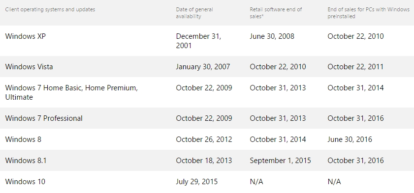 Konec prodeje se v termínech Microsoftu rovná „datu, kdy konkrétní verze Windows už není dodávána do maloobchodu či výrobcům koncových zařízení, kteří Windows předinstalují na svá zařízení v podobě tzv. OEM (Original Equipment Manufacturers) verzí.“ Krabicová verze Windows 7 přestala být oficiálně prodávána 31. října 2013, Windows 8.1 pak 1. září 2015. Letošní poslední říjen pak byl posledním dnem prodeje OEM verze těchto systémů. To ovšem z Windows 7 a Windows 8.1 nedělá nadále nepoužitelné operační systémy. I když hlavní podpora Windows 7 už skončila a u Windows 8 končí 9. ledna 2018, prodloužená podpora bude tyto systémy zásobovat bezpečnostními záplatami ještě dlouho po ukončení podpory hlavní. Windows 7 by mělo být takto chráněno do 14. ledna 2020 a Windows 8 dokonce až do 10. ledna 2023, přičemž primární service packy Windows 7 SP1 a Windows 8.1 jsou dostupné stále. Windows 10 by měly být ošetřovány hlavní podporou do 13. října 2020 a podporou rozšířenou až do 14. října 2025, ovšem to se týká primární verze Windows 10 z července 2015. Předpokládá se, že tato data budou stále posouvána dopředu v souladu s povyšováním systému velkými upgrady (ať už letošním výročním povýšením či na rok 2017 plánovaným Creators Update). Ani konec prodeje OEM verzí ze strany Microsoft ovšem neznamená, že by správci firemních počítačů či jacíkoliv jiní milovníci Windows 7 už nenainstalovali systém svého srdce na nové počítače. Stačí: