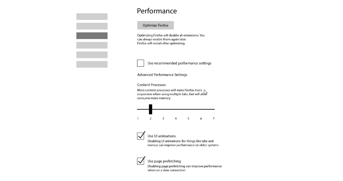 Sedmého dubna bylo na Bugzille (tj. platforma pro sledování chyb ve Firefoxu) otevřeno nové téma - a to sice ohledně budoucí položky nastavení Výkon. Ta umožní optimalizovat výkon prohlížeče (což dle aktuálních informací např. pozastaví provoz všech spuštěných rozšíření) - a to buď automaticky dle analýzy systému provedené aplikací samou, nebo na přání uživatele. Aktuálně se počítá s ovlivněním: