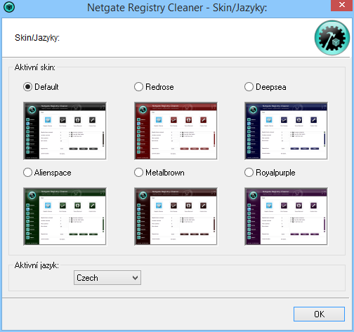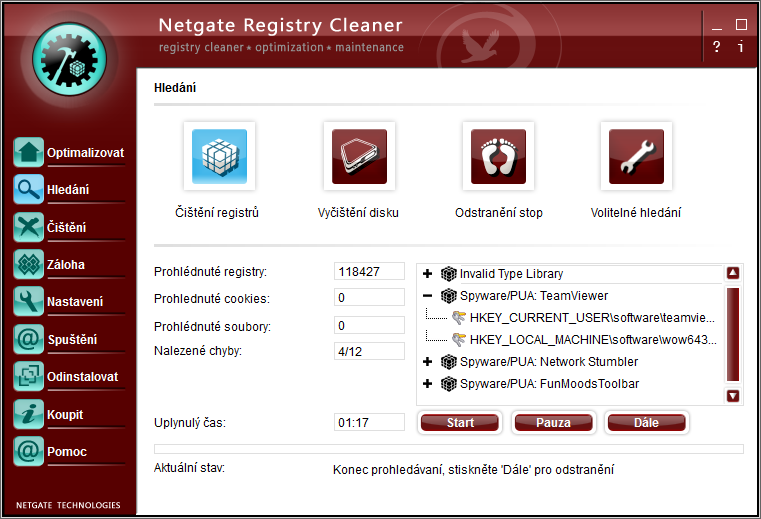 Netgate Registry Cleaner potěší instalací v češtině. Instalace je prostá jakýchkoliv záludných voleb. Hned po spuštění nás aplikace nechá vybrat skin a jazyk rozhraní. Nechybí čeština, ani slovenština – vzhledem k tomu, že autoři jsou Slováci. Ve výchozím okně vidíme hlavní nástroje aplikace: Čistění registrů, Vyčistění disku a Odstranění stop a volbu Volitelné hledání. Analýza Čištění registrů zobrazí nalezené potenciálně závadné typy registrů a po rozkliknutí zobrazení jednotlivé řetězce registru. A po pokračování Dále nabídne jejich odstranění nebo ignoraci. Vyčištění disku prochází cache prohlížečů, dočasné soubory Windows a jeho uživatelů a Koš. Opět nabídne přehled jednotlivých položek a možnost jejich odstranění či ignorování. A nástroj Odstranění stop se týmž způsobem postará o odstranění stop minulé činnosti v systému (tedy záznamy typu Poslední dokumenty a cookies browserů). Volba Volitelné hledání v podstatě supluje komplexní čištění na jedno kliknutí známé z jiných optimalizátorů. Když prohlédneme boční menu, najdeme: