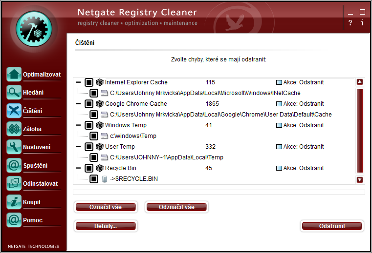 Netgate Registry Cleaner: vyčištění registrů, cache a stop činnosti KE STAŽENÍNetgate Registry Cleaner je nenáročná aplikace nabízející vyčištění potenciálně závadných registrů Windows, dočasných souborů systému a cache prohlížečů, odstranění stop činnosti a zálohování provedených změn.