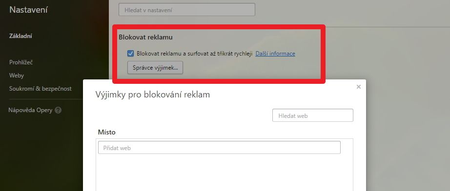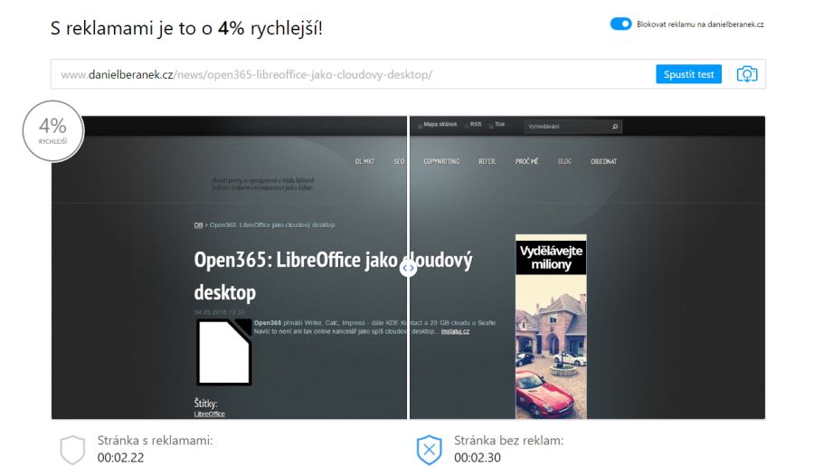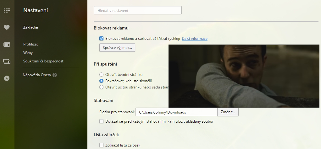 Video pop out vám umožní koukat neustále na video v ořezaném okně. Funkce identifikuje video obsah na stránce. Vygeneruje na něm ikonku svého spuštění a po její aktivaci se video zobrazí v okně bez jakýchkoliv ovládacích prvků prohlížeče (zůstanou pouze ovládací prvky ve videa samotného). Oknu pak upravíte velikost a umístíte si ho kdekoliv na pracovní plochu. Díky fičurce video pop out už nikdy nebudete muset pracovat bez koukání na telku. Blokování reklam je ve výchozím stavu vypnuto a musíte jej povolit. Najdete ho v Nastavení - Základní - Blokovat reklamu. Defaultně jsou ve výjimkách blokování Baidu, Facebook, Google a Yandex, ale i ty můžete vyhodit a užívat si tak internetu bez všech identifikovaných reklam. Blokátor je integrovaný, postavených na nativních technologiích Opery a reklamních filtrech typu EasyListu. Díky tomu funguje již na úrovni vykreslování webu a využívá nativního kódu a algoritmů Opery pro operace běžně prováděné blokovacími doplňky. Proto je také velmi rychlý a přitom i nenáročný na systémové prostředky. Fungování blokátoru můžete vyzkoušet prostřednictvím ikonky modrého štítu zcela vpravo v adresním řádku. Jejím poklepáním se dozvíte, kolik bylo na daném webu zablokováno reklam, rychle zapnete/vypnete blokování reklamy, ale také zde najdete položku Test rychlosti s reklamami a bez nich, který vás přenese na web, jenž emuluje načítání daného webu bez reklam a s nimi. V testové případě web vtipně lépe skóroval s načítanými reklamami. Blokátor reklam je přítomen i v nové verzi pro Opery Mini pro mobilní zařízení. Sedmatřicátá Opera podporuje poslední Chromium/Blink verze 50, ovšem při zachování podpory zastaralých operačních systémů, kterou např. Google Chrome opustilo. Vylepšena byla stabilita a opraveny chyby. Integrované VPN je dle vývojářů v plné testovací zátěži a ti se už těší, až ho budou moci uvolnit coby součást stabilní verze prohlížeče. Zdroje: Opera Blogs, Opera release notes