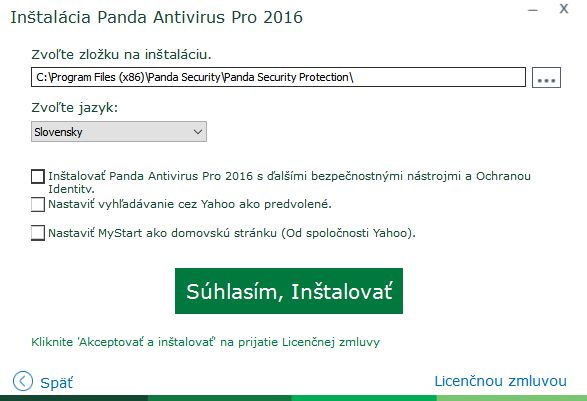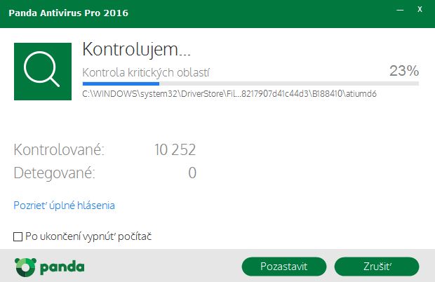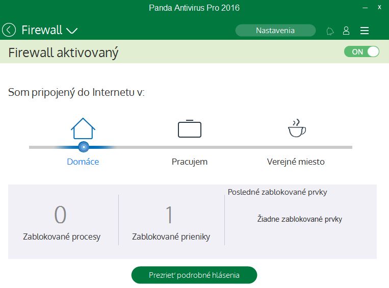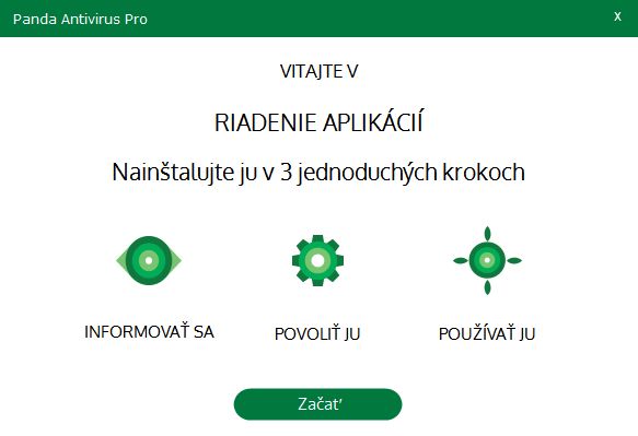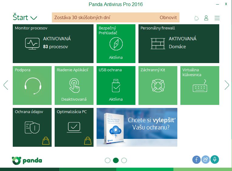 Jako u každého jiného antiviru, nejdřív odinstalujeme starý antivirus a provedeme restart. Abychom předešli zbytečným konfliktům, nedejbože poškození části jádra systému ústící ve smyčku přeinstalací Windows. (Ostatně i při instalaci se vyhněte jejímu přerušování, které může vést k obdobným problém. Lépe je nechat takovou instalaci proběhnout a pak odinstalovat.) Pokud se tedy vyhneme těmto nástrahám, můžeme už s klidem v duši instalovat. Krom umístění Pandy v systému a otravných předvoleb typu toolbar, výchozí vyhledávač a domovská stránka lze již vybrat jazyk prostředí. Ačkoliv tam čeština není, neanglofilové zvolí Slovensky (pozor jen na Slovenski, což je slovinština:). Panda si stáhne, rozbalí soubory, aktualizuje systém a už je připravená nás chránit. Optimálně ještě restartujeme, aby si antivirus mohl pohrát s jadernými částmi systému. Panda Antivirus ProPanda sází na jednoduchost. První indicií je zeleno-bílé výchozí rozhraní – pokud jen kouknem´ do menu, zjistíme, že nás jednoduchý design bude provázet i dále. Stav rezidentní ochrany počítače vidíme ve velkém okně Antivírus vlevo, vpravo najdeme spouštění cílených kontrol (Kontrola), odkaz pro stažení Pandy pro jiná zařízení (Dalšie zariadenia), správu licencí daného poskytovatele (Moje produkty) a Wi-Fi ochranu - soubor funkčních a bezpečnostních nastavení Wi-Fi připojení. Cílené kontroly zahrnují klasicky rychlou kontrolu Kritické oblasti, Plnou kontrolu (u níž nás Panda varuje, že může trvat několik hodin) a kontrolu zvolených oblastí. Rychlá kontrola trvala 10 minut 10 sekund při analýze 37 659 objektů. Další nástroje PandyK dalším nástrojům se dostaneme buď přes horní menu Štart, nebo přejdeme v rozhraní Pandy vpravo. Monitor procesůPanda vyhodnocuje a monitoruje procesy spuštěné v systému. Uživateli nabízí jejich výpis včetně vyhodnocení rizika a informacích o síťovém provozu. U tohoto údaje se navíc dá podívat konkrétně, s kterými adresami proces komunikuje. A jednotlivé procesy lze zablokovat, a tím příslušný program přesunout do karantény. Bezpečný prohlížeč sděluje pouze, jak jsou Pandou chráněné prohlížeče a zde byly zaznamenány pokusy o útok. FirewallFirewall je opět proveden velmi jednoduše – až tak, že vás to hned svede k rozkliknutí jeho nastavení (tlačítko nahoře). V nich už naštěstí vidíme klasické funkce firewallu: