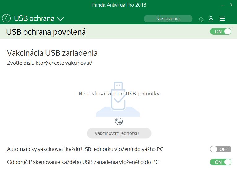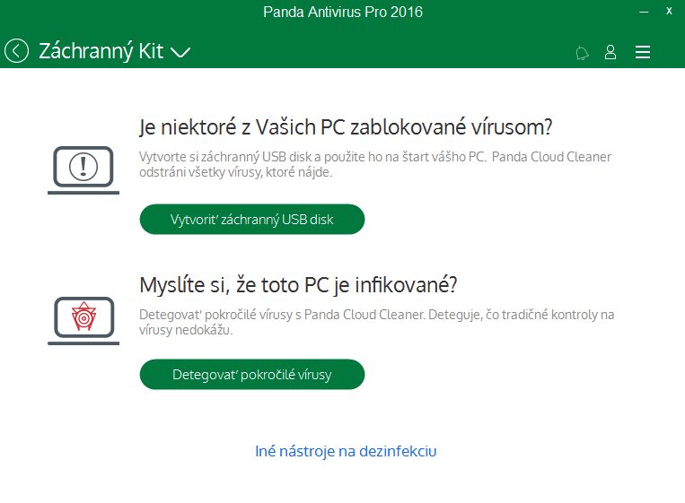 Podpora pouze odkazuje na spravované komunitní fórum a webový formulář technické podpory. Řízení aplikacíŘízení aplikací není defaultně přítomno. Je nutné ho doinstalovat. Panda nás nejprve informuje, co řízením aplikací myslí: uživatelův dohled nad spouštěnými procesy. De facto se jedná o segment, které bývají běžně součástí firewallu v režimu uživatelova dohledu. Vyžaduje sice uživatelovu pozornost, kterou ovšem vyváží to, že v systému pak neběží zbytečné procesy (s rizikem pozastavení některých důležitých služeb, což se ovšem dá zvrátit). USB ochranaUSB ochrana zahrnuje tzv. vakcinaci USB, čímž se ve slovníku Pandy myslí, zabránění automatickému spuštění souborů typu autoplay. Panda sice takto vakcinuje i chráněný systém (systém sám brání těmto autoplay souborům), touto USB ochranou je ovšem docíleno toho, že se autoplay programy daného USB nespustí na jiném, takto nevakcinovaném počítači. USB ochrana navíc nabízí možnost automatické nabídky antivirového skenu pro každé vložené USB. Záchranný kitZáchranný kit obsahuje jednak nástroj na vytvoření záchranného USB. Jeho pomocí nabootujeme počítač, bez přítomnosti běžného systému a za asistence Panda Cloud Cleaneru detekujeme a pokusíme se odstranit zákeřný malware typu rootkitů. A dále zde najdeme instalaci programu Panda Cloud Cleaner přímo do systému. Takto se můžeme pokusit odstranit malware v mezikroku za běhu běžného systému. Virtuální klávesnice slouží k zadávání citlivých údajů – např. loginu a hesla do internetového bankovnictví. Dobře poslouží všude tam, kde se obáváte přítomnosti zákeřného malware s keyloggerem zneužívajícího odposlouchávání fyzické klávesnice. Ochrana údajov a Optimalizácia PC jsou pouze odkazy sloužící k zakoupení vyšších verzí programu Panda. Ochranou údajů se myslí pro mnohé jistě užitečné správce hesel, zatímco optimalizace PC vede k balíčků nástrojů, které se dají pořídit či suplovat jinak. Na nabídku všech verzí ochran vede i poslední políčko Chcete si vylepšiť Vašu ochranu? Konfigurace a Nastavení Pandy