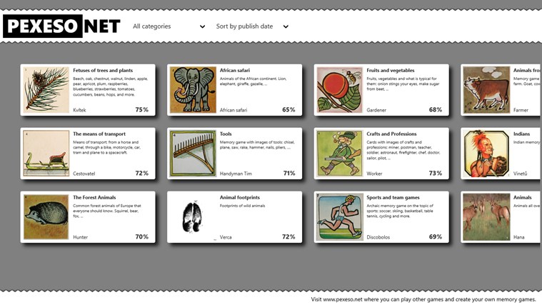 Na výběr je hned několik motivů postaviček, které budete muset ve hře Pexeso odhalovat a po-spojovávat. Jedná se tedy o mírně logickou a hlavně hodně zábavnou hru, kterou české rodiny milují již dlouhé roky a pokud i vy mezi ně zapadáte - není nic lepšího, než si k sobě na počítač nebo notebook tuto dokonalou hru nainstalovat a ukázat si ji v praxi a zahrát na vlastní kůži.