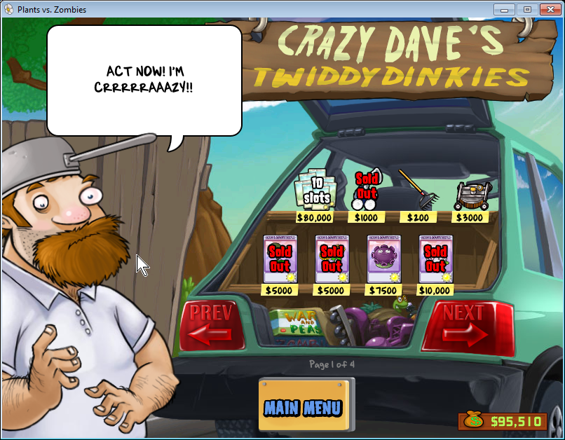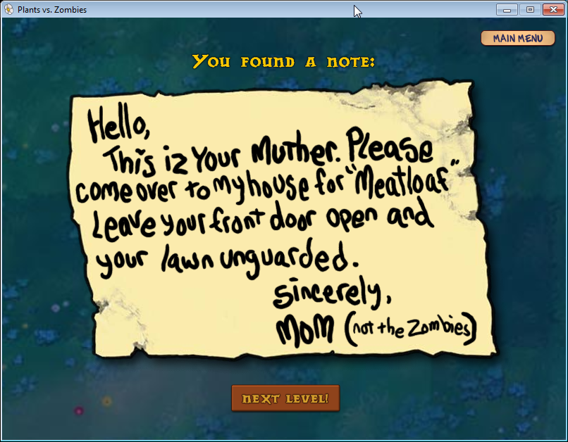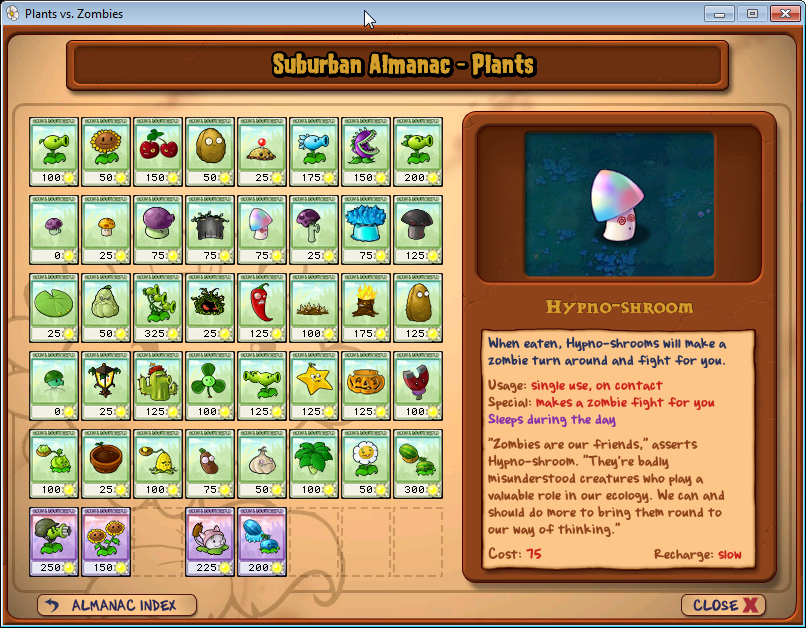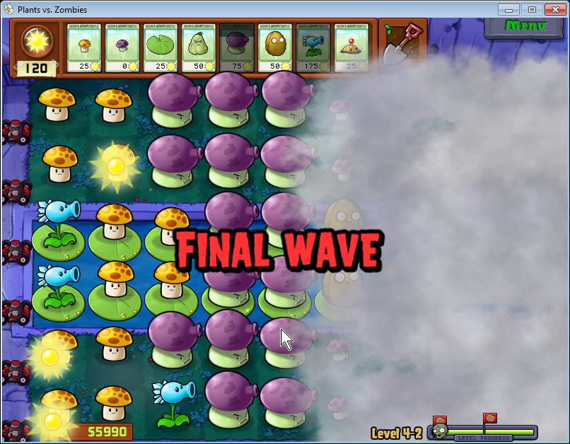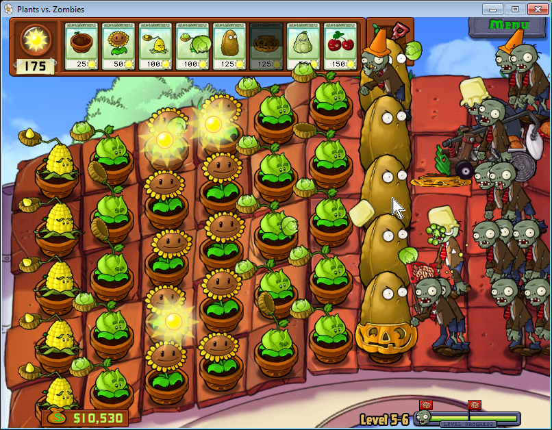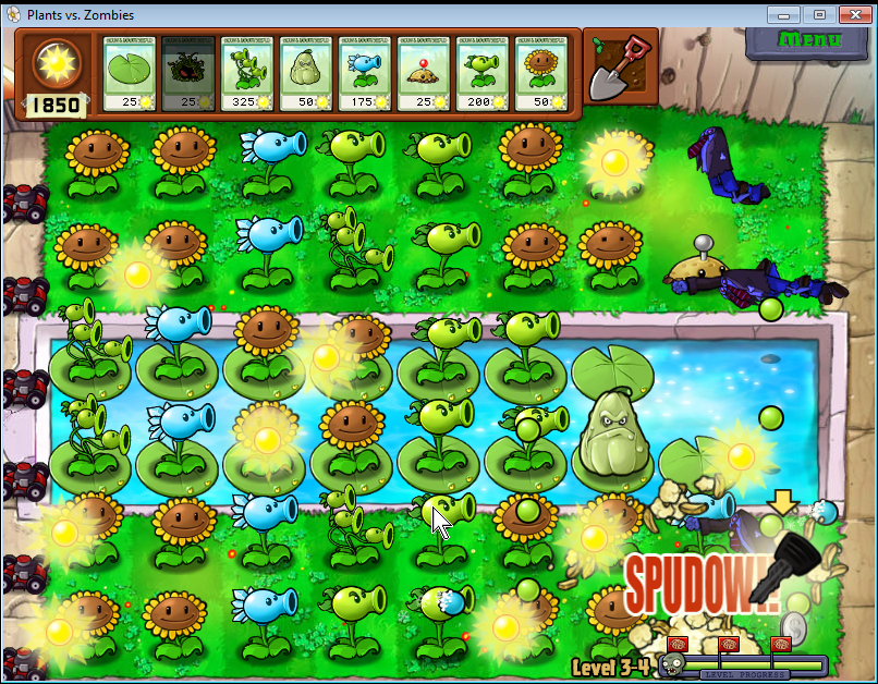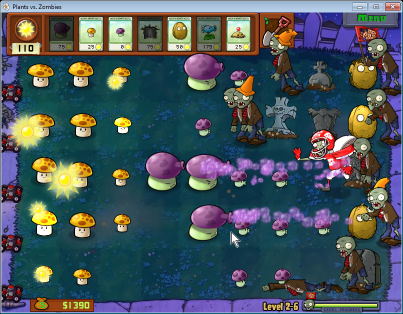 Po prohoubičkované noci se nejspíš namočíte – to až budete čelit dalším hordám, které váš barák chtějí vzít útokem přes bazén. V obraně přibudou lekníny, zámotky čepelatky, bodláčí, obrovské ořechy a hořící pařezy. Postupem hry se odemknou různá mini-dobrodružství, kterými si můžete oddechnout od postupu hlavním questem. Když zombíci u bazénu neuspějí ve dne, zkusí to pod rouškou mlhy a soumraku. Na pomoc vám přispěchají nejen houby z nočního questu, ale také mořské houbičky, lucerna, kaktusy a foukáček. Útočníci naproti tomu využijí mlhy, lítající potvory, delfíny a krtky. Občas se vás zombíci pokusí odlákat z boje vzkazem pravého bezmozka... A když se ani v té tmě, dešti a mlze nevzdáte, tak ty mrchy nemrtvý vylezou na střechu. To je jen pár momentů z hlavního questu. Když jím projdete, čeká na vás na 20 mini-her různě si pohrávajících se zombíky a rostlinkami. Dále puzzle s vázami, v nichž jsou zombíci a rostliny, a puzzle, v němž se postavíte na stranu zombíků a musíte zdolat obranné linie. Ještě si užijete questy přežití v prostředích, jimiž jste již prošli v hlavní hře. Mají dva stupně obtížnosti, a na zaryté obránce pak čekají nekonečné přívaly zombií v tzv. endless verzi. A ani hlavní hru nemusíte úplně odepsat, dá se hrát znovu a znovu s narůstající obtížností. Plants Vs Zombies 1Jednička Plants Vs Zombies od roku 2009 nezestárla ani o kousek. Proto si také postupně našla cestu na platformy Applu, herní zařízení, Android i sociální sítě. Mistrně vyvažuje náročnost a hratelnost. Namísto oddělených tutoriálů postupně vtahuje hráče do svého světa a učí ho nejen likvidovat zombíky, ale také se tím skvěle bavit. Hra vychází z věžovek (tower-defense her), které kombinují strategie (zjednodušené na přivádění nepřátel do předem daných linií), zábavnost plošinovek a napětí akčních her. Počáteční střet hrášku se zombíkem je ve hře tolikrát popozměňován, že si na něj ve vyšších úrovních ani nevzpomenete. Naopak musíte kombinovat různé obranné prvky, abyste vůbec přežili útočné kombo bandy zombíků. Hru rozběháte i na XPéčkách s 1,2GHz procesorem, 512 MB RAMky a integrovanou grafikou. I když je PVZ anglicky, brzy pochopíte, že na jedné straně jste vy a rostliny nakoupené za energii slunce a na straně druhé jsou oni – zombies všelijak vylepšení. A ač se budete snažit sebevíc, stejně se mnohokrát objeví: A pokud by zombie pronikaly příliš často, tak zkuste pár tipů: