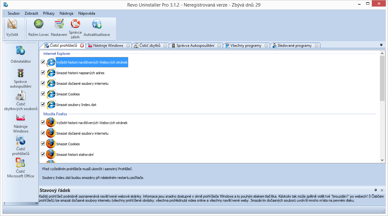 Čistič prohlížečůČistič prohlížečů nabízí vyčištění historie navštívených stránek a stahovaných souborů, smazání dočasných souborů, cookies a souborů Index.dat Internet Exploreru, Firefoxu, Chrome a Opery. Čistič Microsoft OfficeNástroj na čištění dokumentů kancelářského balíků Microsoft Office nabízí vyčištění dočasných souborů programů Microsoft Word, Excel, Access, PowerPoint, FrontPage a to včetně jejich starších verzí. Nástroje ještě obsahují Čistič Windows, Úplné vysypání Koše a Neobnovitelný výmaz.