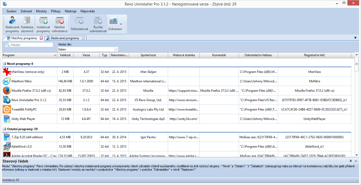 Instalátor Revo Uninstaller Pro hned potěší češtinou, ale možno vybrať aj slovenčinu a jiné jazyky. Po odsouhlasení licenčních podmínek si vyžádá upřesnění umístnění a volby ikon a už ho můžeme spouštět. Revo Uninstaller Pro nás přivítá designem dnes již starých Windows 7. Zobrazí Ikony/Seznam/Detaily nainstalovaných aplikací. Dvě karty (Všechny programy a Sledované programy) napoví, že Revo pracuje minimálně ve dvou režimech a z horní lišty zase snadno odvodíme, že lze Odinstalovat, Rychle odinstalovat a Násilně odinstalovat. Nejvíce relevantních informací o programech nám poskytnou Detaily. Přehledně zobrazují: