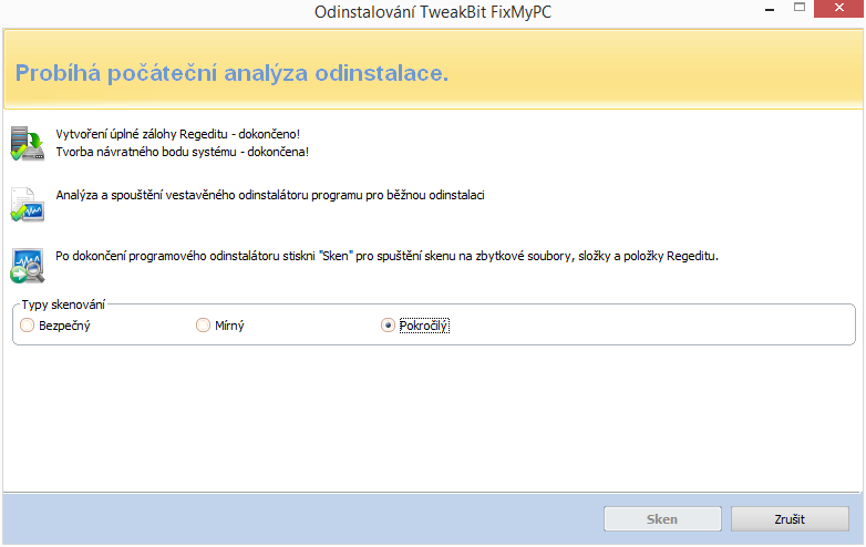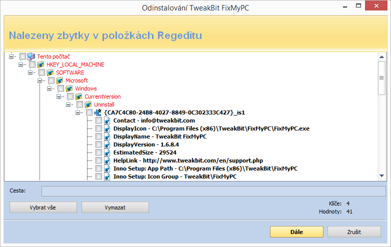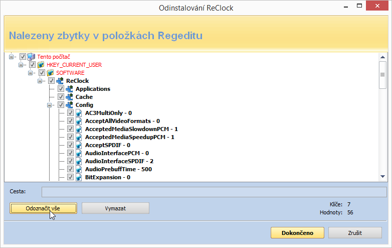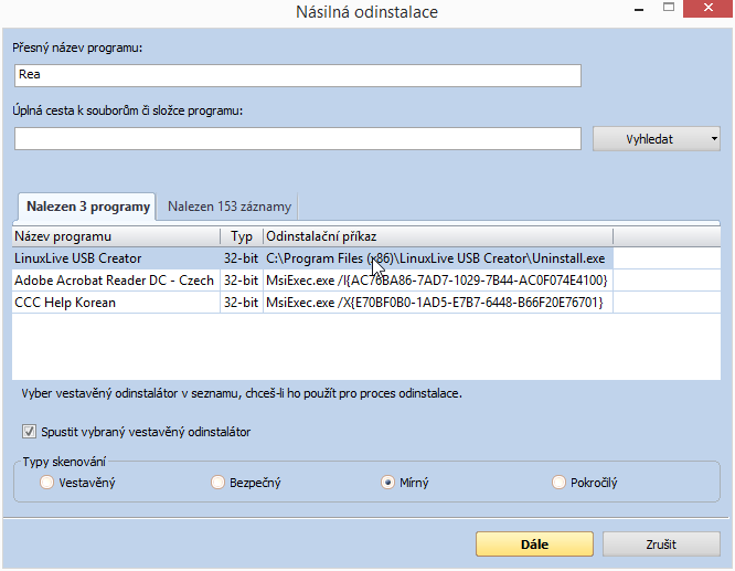 Výsledky skenu pak Revo Uninstaller zobrazí formou seznamu, ze kterého je možno vybrat položky, které mají být odstraněny - samozřejmě nabízí volbu Vybrat vše pro výmaz všech zbytků po programu. Ve dvou krocích takto vymažeme všechny aplikační zbytky v registru i na disku. Rychlá odinstalaceVolba Rychle odinstalovat automaticky vytvoří bod obnovy systému a zálohu registru. Inicializuje programový odinstalátor a po ukončení jeho činnosti ještě nabídne skenování zbytkových položek programu stejně jako u delší verze odinstalace. Násilná odinstalacePříkaz Násilná odinstalace se hodí