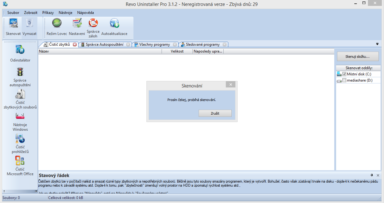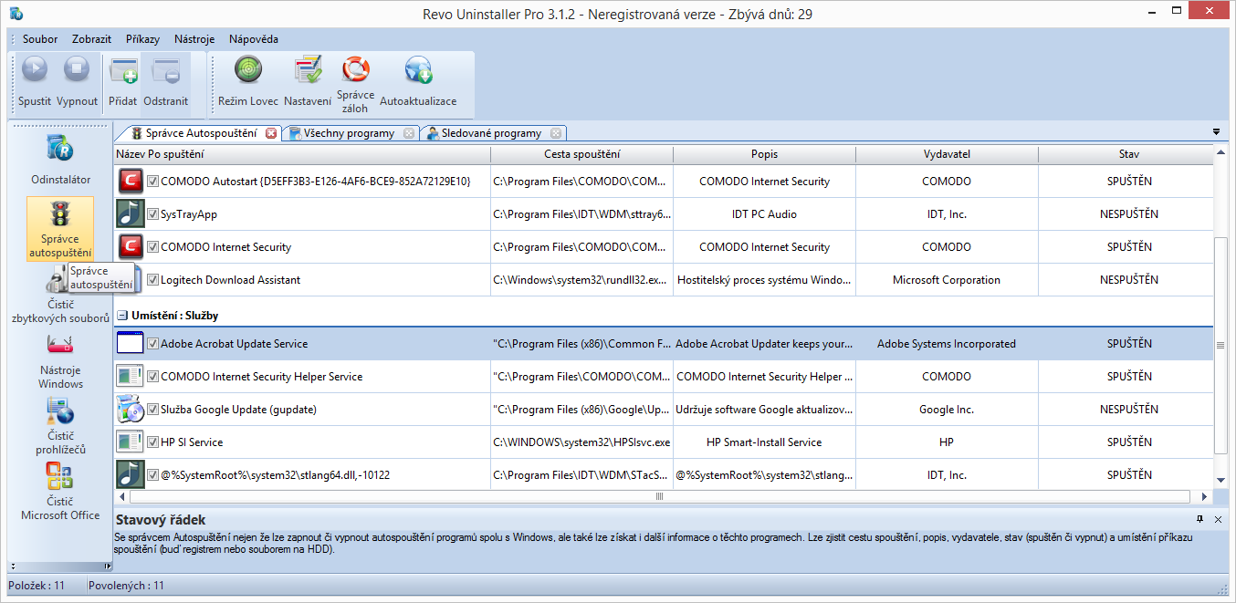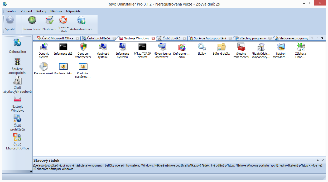 Násilná odinstalace se dá navíc použít k odstranění zbytků již odinstalovaných programů. Stačí zadat cestu k daným souborům či složkám, případně zadat Přesný název programu. Revo Uninstaller již při zadávání prohledává systém a nabízí odpovědi v našeptávači. I pokud nenalezne vestavěný odinstalátor, proskenuje kompletně systém a nabídne odstranění instalačních zbytků (viz níže). Obnovení odinstalovaného programu ze zálohyPokud bychom si odinstalaci rozmysleli, stačí vyvolat Správce záloh. Toho najdeme pod Nástroji, ale i na hlavní liště, kde se po první odinstalaci objeví jeho ikonka. Nabízí automatické, nebo ruční obnovení. To spočívá ve výběru položek jak v registru, tak na disku, které se mají obnovit. A umožňuje také úplného smazání záznamu odinstalovaného programu. NástrojeKlasické funkce odinstalátoru a čističe instalačních zbytků Revo Uninstaller doplňuje ještě o další čistící utilitky. Můžeme je buď spouštět přes horní menu z Nástrojů, nebo je nechat permanentně zobrazovat vlevo na boku volbou z téhož menu v Zobrazit. Správce autospuštěníSprávce programů spuštěných se startem systému patří k fičurám notoricky přítomným ve všech optimalizačních a čistících programech. Správce autospuštění Revo Uninstaller zaujme strukturovaným skenem v registru 32bitových a 64bitových aplikací a Službách, vyšší citlivostí oproti kolegům (zachytil i neplatné, nespuštěné a konkurencí nezachycené záznamy) a indikací aktuálního Stavu spouštěného programu. Čistič zbytkových souborůČistič zbytkových souborů povyšuje odstraňování různých zbytkových položek po odinstalovaných programech. Místo aby parciálně skenoval zbytky pouze jednoho zadaného programu, prohledává všemožné zbytky po nejrůznějších instalací v celé cílové složce, popř. kompletně na zadaném disku. Při mazání nalezených položek je třeba opatrnosti - např. při testu identifikoval jako zbytkové položky části účetního programu, které sice vzhledem k opakované instalaci zbytkovými opravdu mohly být, ale také nemusely. Nástroje WindowsMnožina Nástrojů Windows obsahuje několik informačních vstupů do systému a nástrojů práce s ním dostupných na jedno kliknutí. Krom těch běžněji se vyskytujících zde najdeme také:
