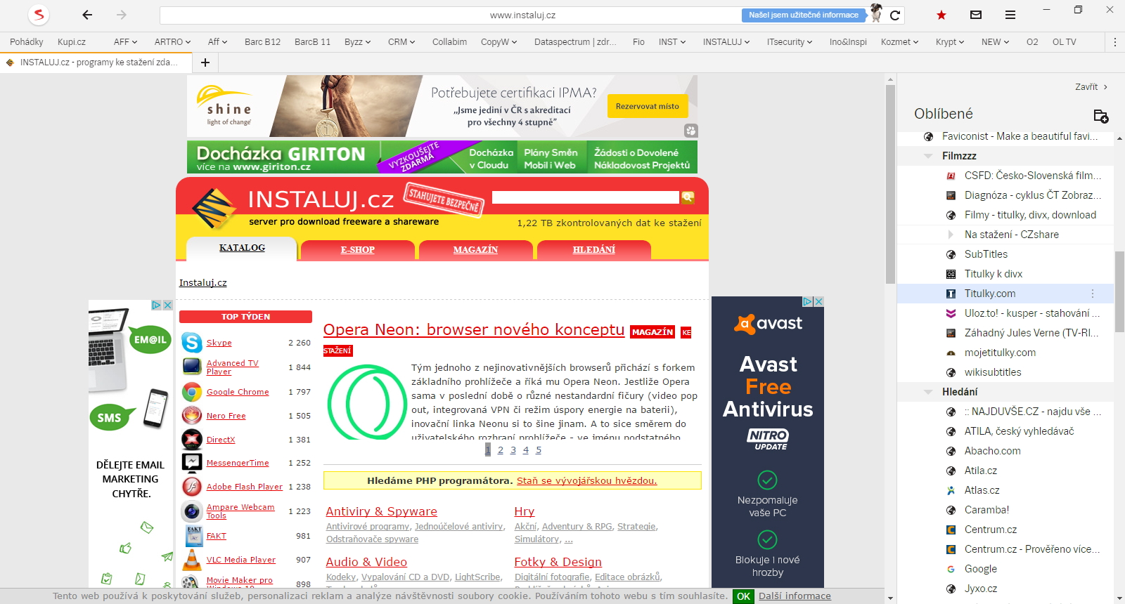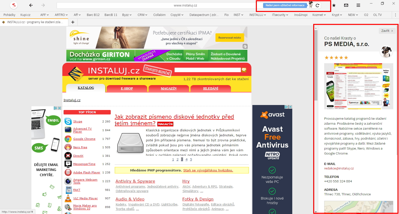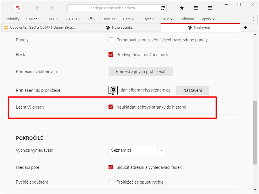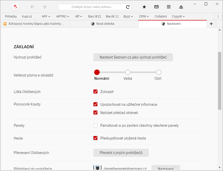 Mail prohlížeče SeznamIkonka obálky upozorňuje na nové maily, které dorazily do schránky synchronizovaného účtu. A to sice na maily ve složce Doručené, složka Hromadné a ostatní jsou ignorovány. V prohlížeči není možno spravovat vícero účtů a emailových schránek od Seznamu. Nástroj k ovládání mailu ani nenabízí přidání emailových účtů jiných provozovatelů. Synchronizuje v přijatelném čase. Frekvenci synchronizace ovšem uživatel nijak neovlivní. Nově dokonce používá push notifikace zobrazující se na ploše, ovšem opět bez možnosti ovlivnění toho, zda je uživatel opravdu chce dostávat. A navíc se zobrazuje se značným zpožděním oproti notifikaci na ikonce mailu a nespolehlivě (konkrétně: z pěti pokusů jednou). Po kliknutí ikonka zobrazí emailovou schránku Seznamu v adresáři Doručené - a to sice otevřením nového panelu. Každé kliknutí rovná se nový otevřený panel s doručenou poštou. Konkurenční řešení detekují aktivní panel pošty v pozadí a pouze jej přesunou do popředí. Velké červené SDomovskou stránku prohlížeče Seznam je Seznam. Nejde to ani změnit - ostatně bylo by to proti logice věci, neboť Seznam je opravdu cílen na uživatele Seznamu. Jediným způsobem, jak jinak užívat výchozí stránky je otevření panelů z minula, které najdeme v Nastavení - Panely - Pamatovat si po zavření všechny otevřené panely. Velké červené S nám poslouží, kdykoliv se ztratíme v moři informací, k návratu na fixní domovskou stránku www.seznam.cz. ZáložkyZáložky zde najdeme coby položku Oblíbené pod ikonkou hvězdičky. Určitě většinu lidí potěší, že se otevřou do klasického, fixního panelu, který nikam nemizí, když nad ním nepluje kurzor. Přidání webu do záložek je kapku komplikovanější: nejprve je třeba mít otevřen panel Oblíbené, otevřen i web a pak zvolit tlačítko + Přidat otevřenou stránku do Oblíbených, případně chytit URL adresu a do seznamu oblíbených ji přenést. Žádné označení stránky coby oblíbené a následné určení cesty k ní zde není. V Nastavení lze zvolit i zobrazení Lišty záložek. Ta je automaticky doplněna o služby Seznamu: Email.cz, Firmy.cz, Mapy.cz, Zbozi.cz, Lide.cz, Pohádky, Kupi.cz. Záložky těchto služeb jsou vyneseny dopředu, ovšem lze je vymazat. Kapku horší je, že jsou záložky Lišty záložek zbaveny původního řádu ve prospěch abecedního seřazení, což z nich činí chaos. Navíc chybí favicony jednotlivých položek, což orientaci dále snižuje. Pejsek Krasty z informační kastyPejsek Krasty na vás z adresního řádku jukne při vícero příležitostech. Vždy s hláškou odpovídající konkrétní funkci prohlížeče, vždy připraven pomoci. Když ho odklikneme, objeví se na pravé straně panel s doplňujícími informacemi, které pro nás Krasty vyčmuchal, či se jinak projeví funkce, kterou právě nabízí. Užitečné informaceKrasty hlásí: „Našel jsem užitečné informace.“ Nalézáme se na stránce firmy, restaurace, úřadu. A Krasty z databáze Firmy.cz čerpá takové věci, jako jsou popis instituce, její adresa, otevírací doba, mail a telefon. Související článkyKrasty hlásí: „Našel jsem související články.“ Nalézáme na stránce, kterou prohlížeč identifikuje coby článek. Krasty identifikuje klíčová slova a prohání je přes Vyhledávač Seznamu. V bočním panelu pak zobrazuje různé dodatečné zdroje, ať už přímo zpravodajské (další články na dané téma), či slovníkové (např. slovníkové heslo na Wikipedii) PřekladKrasty hlásí: „Našel jsem překlad stránky.“ Nalézáme se na cizojazyčné stránce - aktuálně pouze na anglických. Krasty pomocí Slovníku Seznamu nabízí překlad komplet celé strany, nebo jednoho slova, nebo vyznačeného úseku. Patrně nejužitečnější je ovšem překlad jednoho slova, neboť ho ukazuje v jump-listu zobrazujícím po vyznačení slova a odkliknutí pravým myšítkem. Překlad fráze se bohužel vypíše místo původního textu, což není úplně ideální stav, pokud se chce člověk domoci významu skrytého v anglické frázi. Při překladu celé stránky vzniká srandovní pelmel na téma strojového překladu do češtiny. Seznam do budoucna plánuje rozšířit paletu překládaných jazyků a jistě bude i nadále pracovat na svém překladači směrem ke srozumitelnému překladu. Další vývoj ostatně čeká celý komplet funkcí skrytý pod personou pejska Krastyho, můžeme tak očekávat jeho napojení na další databáze i další práci s organizací vyhledaných informací. Slepota historie vůči lechtivým stránkámProhlížeč Seznam zachovává diskrétnost ohledně lechtivých stránek, které jste si prohlíželi. Slovy Lukáš Kováče, produktového manažera browseru: „V okamžiku, kdy uživatel spustí například RedTube nebo Pornhub, prohlížeč automaticky zareaguje a sám pozná, že se jedná o stránky, které nejspíš nechcete mít uložené v historii, a neuloží je. Pak se vám nestane, že vám začne nešeptávat něco, čím byste se před ostatními chlubit nechtěli.“ Tato funkce je spojená s projektem Porno detektor, který provádí analýzu obrázků a textu na cílovém webu a snaží vyhodnotit obsah potenciálně závadný. Funkce dle všeho není implementována přímo v prohlížeči. Prohlížeč ani ostatně okamžitě nekontaktuje servery Seznamu, aby se jich poptal, zda má právě zobrazovaný web z historie vynechat. Dle reakcí uživatelů se spíš zdá, že Porno detektor generuje blacklisty cílových adres, a že blokovány jsou především známé porno portály. Spuštění funkce najdete v Nastavení - Lechtivý obsah - Neukládat lechtivé stránky do historie a defaultně je zapnutá. Nastavení a jinéHistorie prohlížení i Stahování se zobra