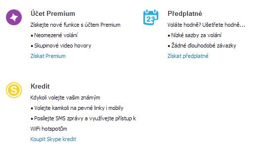 Skype je šířen jako freeware, ale některé jeho funkce jsou zpoplatněny. Mezi tyto funkce patří například skupinové videohovory, volání na telefony nebo odesílání SMS. Pro různé funkce si můžete vybrat mezi možnostmi Účet Premium, Předplatné nebo Kredit.