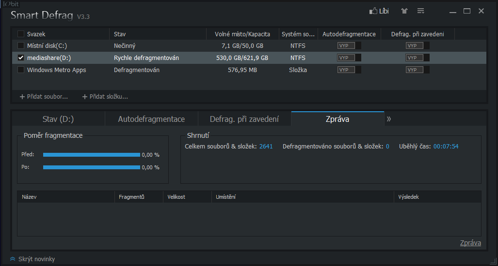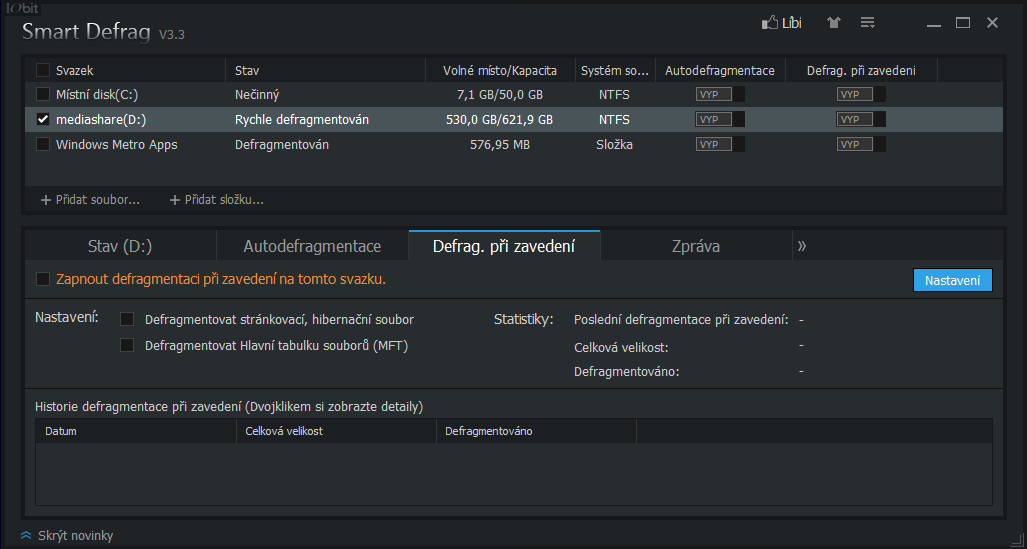 Spodní polovina okna pak simuluje probíhající defragmentaci a Autodefragmentaci, volby Defragmentace při zavedení a zprávy proběhlých akcí. Rolovací menu Analýza umožňuje výběr mezi analýzou rychlou a hlubokou, přičemž Hluboká analýza bere v potaz i zbytečné soubory, které je možno smazat. Roletka Defragmentace pak nabízí volby: Jen defragmentace, Defragmentace a rychlá optimalizace, Defragmentace a optimalizace a Defragmentace a upřednostnění souborů. Optimalizace spočívá v odstranění zbytečností identifikovaných hlubokou analýzou. Upřednostnění souborů trvá ze zmíněných operací nejdéle a mělo by urychlit přístup systému k často používaným souborům. AutodefragmentaceZáložka Autodefragmentace zobrazuje zátěž procesoru, zápis na disk a statistiku automaticky defragmentovaných souborů. V Nastavení specifikujeme, zda chceme autodefragmentovat pouze v případě, že je systém nečinný (a jak dlouho), a zda má být autodefragmentace pozastavena, pokud by využívala příliš mnoho prostředků. Defragmentace při zavedeníDefragmentace při zavedení dovoluje aplikaci přemístit ty soubory, které nemůže bezpečně přesunout za běhu Windows. Při její volbě nás Smart Defrag upozorní, že bude vypnuto rychlé spouštění systému. Krom jiného můžeme defragmentovat stránkovací soubor a hlavní tabulku souborů a v Nastavení upravíme, zda defragmentace proběhne při následujícím zavádění systému, každém zavádění, každý den či v delších frekvencích. Nastavení Smart DefragVolby jednotlivých funkcí jsou soustředěny také v Nastavení, které najdeme pod ikonkou třech čárek vpravo nahoře. Krom funkcí zmíněných lze zde také upravit seznam optimalizovaných typů souborů (rozuměj souborů určených k odstranění), seznam výjimek z defragmentace a Obecná nastavení zahrnující krom běžných voleb také možnost defragmentovat technologií Smart Silent a zastavit VSS při defragmentaci svazku NTFS. Sečteno, podtrženoSmart Defrag je nástroj k defragmentaci Windows dostupný zdarma. Uspořádáte s ním soubory ve všech Windows od verze 2000 výše. Výhody Smart Defrag