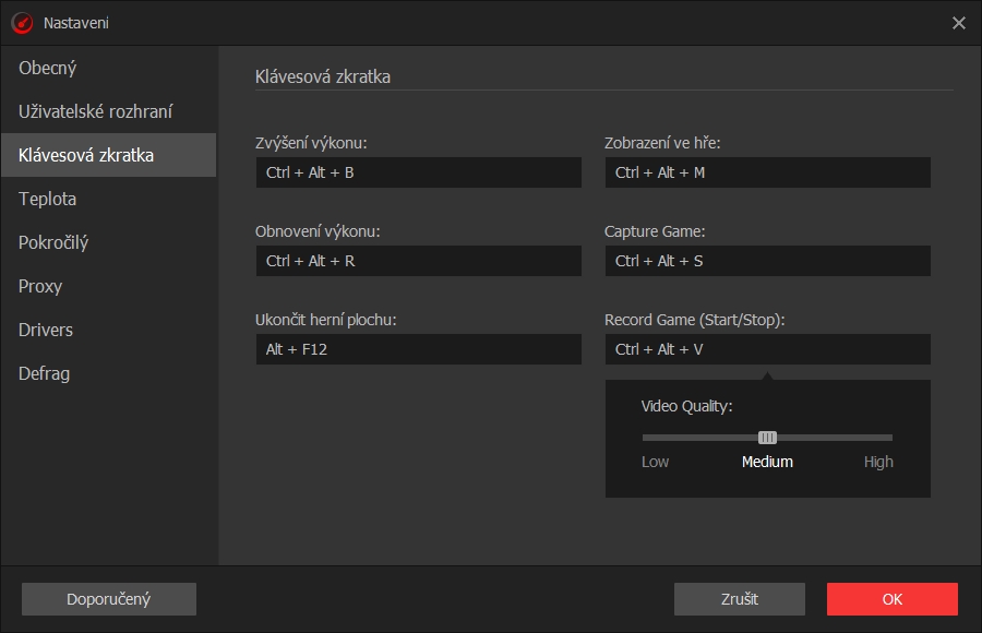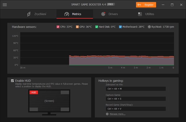 Pro ty, kteří chtějí mít přehled o teplotách a FPS (snímkové frekvenci) v reálném čase, nabízí Smart Game Booster zobrazení obrazového pole HUD s těmito údaji přímo ve hrách. Klávesové zkratky pro přímé ovládání Smart Game Booster ve hráchAplikace nabízí i klávesové zkratky, jejichž pomocí se dá přímo přistupovat k jejím funkcím. V rozhraní pod Metrics (a v plném zobrazení ještě v Nastavení) se dají konfigurovat. Klávesovými zkratkami lze volat: