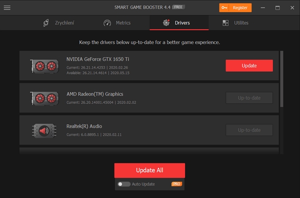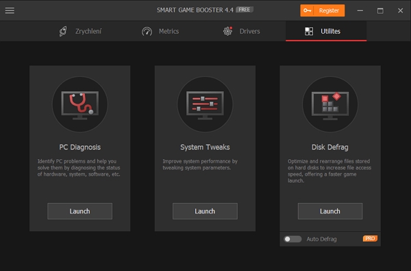 Drivers (ovládače)Sekce ovládače se soustředí na aktuálnost ovládačů nejen herního železa, ale v podstatě všeho, s čím hry přicházejí do styku (zvuk, externí periferie aj.) Identifikuje ovládače v systému a vypíše, pokud jsou dostupné novější. Nabídne jejich aktualizaci. A v případě, že uživatel upgraduje na PRO verzi, program nabídne automatizaci celého procesu. Utilities (Nástroje)PC Diagnosis (diagnostika)Diagnostika využije systémový nástroj a vytáhne z kompu veškeré informace o systému, o běžících procesech a službách, o systémových komponentách a hardwarových součástech, přičemž se snaží získat info i tom, zda je vše funkční. Kompletní přehled nabízí k exportu do textového souboru TXT. Krom toho lze využít ještě online testy pro okamžité zjištění funkčnosti periferií: System Tweaks (fígle pro optimalizaci systému)Systémové fígle jsou fakticky úpravami systémového registru Windows. Zaměřují se na nepřeberné spektrum specifických operací snižujících časy reakcí při provádění rozličných úkonů, minimalizaci kontaktu s úložištěm, počty náhledů, připojení, velikosti cachí apod. Systémové tweaky lze provést buď nahrubo předvolenou hodnotou, nebo vpravo dole zaškrtnout Expertní mód a uživatelsky pozměnit hodnoty konfigurovaného klíče systémového registru. Disk Defrag (defragmentace disků)Systémy využívající pevné disky může Smart Game Booster popohnat i pomocí defragmentace tohoto typu úložiště. PRO verze pak nabízí automatizaci defragmentací. Nastavení Smart Game BoosterKonfigurace Smart Game Booster je spíše prostá. Nejzajímavější sekcí je nastavení teplot, které vyžadují už zvýšenou pozornost => a tím pádem na ně chce být uživatel upozorněn alarmem. Systém od systému se ovšem hodnoty, které je třeba považovat za kritické, mohou lišit. Proto by právě zde měl uživatel věnovat trochu času správnému nastavení. Jinak je možno zapnout automatizací defragmentací a aktualizací ovládačů, pokud máte PRO verzi. Šikovně je nastaveno automatické zrychlení pro identifikovaného (a ručně přidané) hry a návrat Windows do normální režimu po ukončení her. Smart Game Booster souhrnemSmart Game Booster se snaží z herního železa vymáčknout výkon rozličnými cestami. Zabíjí procesy, ukončuje spuštěné služby, nabízí rozličné zásahy do registru, udržuje aktuální ovládače a uklízí pevné disky. Díky tomu všemu je schopen uvolnit výpočetní kapacitu nutnou pro zvýšení snímkové frekvence a vykreslování herního obsahu vůbec. Zajímavě jsou koncipovány tweaky systémového registru, které se zaměřují na opravdu různorodou směsici fíglů. Aplikace už při instalaci vygeneruje 2 ikony: jednu pro běžné spuštění programu do uživatelského prostředí a druhou pro přímé zvýšení herního výkonu bez nutnosti další interakce s programem. Po konfiguraci Smart Game Boosteru je možné s klidem využívat klidně už jen tu druhou ikonku. Výhody Smart Game Booster