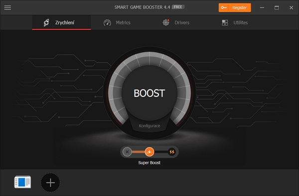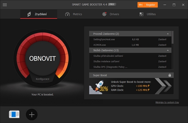 Instalace Smart Game Booster nás přivítá systémovým rozhraním instalace (tedy nikoliv nadesignovanou obrazovkou samotného vývojáře PCGameBoost). Česko-anglická směska popisů už dopředu naznačí, že stejným způsobem bude lokalizované celé uživatelské rozhraní. Patrně využívá strojového překladu, nicméně rozhraní používá jednoduchých popisů a žádným zásadním způsobem to nevadí. Vybereme systémové umístění a v mžiku je instalace hotová. Optimalizace systému pro hrySmart Game Booster rovnou nabízí optimalizaci PC pro hry. Tu reprezentuje ústřední tlačítko Boost, přičemž míru dané optimalizace lze ovlivnit volbami níž Super Boost Level I, Super Boost Level II (dostupný pouze v PRO verzi) a Konfigurace. Po odpálení zvýšení výkonu se protočí tachometrově designované tlačítko a program vypíše seznam zastavených procesů, služeb a dalších úkonů. Mezi ty patří:
