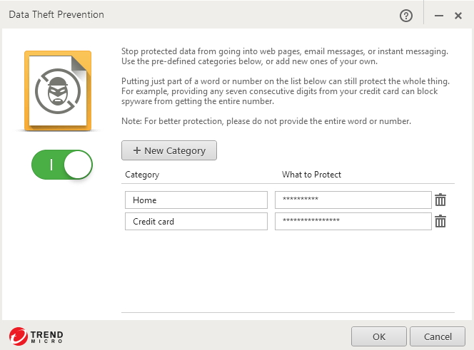 Dále zde najde Social Networking Protection (taktéž zcela obstarávaný doplněk Trend Micro Toolbar) a Data Theft Protection. Data Theft ProtectionPoložka Data Theft Protection má slučovat nástroje rodičovské kontroly, datového trezoru a ochrany dat před ztrátou a krádeží. Celý komplex je zabezpečen heslem, ke kterému si uživatel může nastavit ještě nápovědu a email pro zaslání zapomenutého hesla. Posláním tohoto segmentu je ochrana citlivých dat, které si uživatel popíše (adresa domova, číslo kreditní karty) a definuje je. Jak ochrana sama funguje těžko říct, neboť v testovém případě nebylo zabráněno jejich odeslání, ani program neupozornil daný mail o nakládání s nimi. DataDalší sada nástrojů obsahuje: