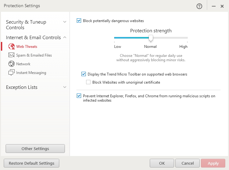 Nastavení Trend Micro Maximum SecurityVeškerá (sic) nastavení programu se skrývají pod onou ikonkou ozubeného kolečka vedle Scanu. Konfigurace např. antiviru je v mnoha bodech velmi zajímavá: od spuštění skenu ještě před ukončením celého zavádění Windows, před stupně ochrany, které může Trend Micro sám flexibilně měnit až po například realtimové skenování i komprimovaných souborů. Po nastavení hlavních utilit zjistíte, že tato nastavení obsahují ještě Další nastavení, přičemž nejde jen o obecné prvky (pozadí, ochranu aplikace heslem, zasílání informací společnost Trend Micro), ale znova třeba i úrovně používané ochrany. Trend Micro Maximum SecurityTrend Micro Maximum Security je program, který má spoustu ALE..., ale ta ALE mají své důvody a jdou i překonat. Je to vysoce účinná ochrana počítače. V posledních detekčních testech AV-Comparatives detekoval malware v 98.4 % případů - s nulovým počtem falešně pozitivních detekcí. V testech nasazení ve skutečném prostředí obstál stoprocentně. Obsahuje spoustu velmi pokročilých utilit a nastavení, díky nimž je tak vysoce účinný při obraně vůči útokům. Ale má ta svá ALE: