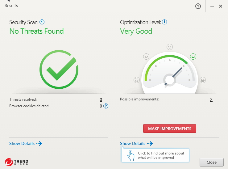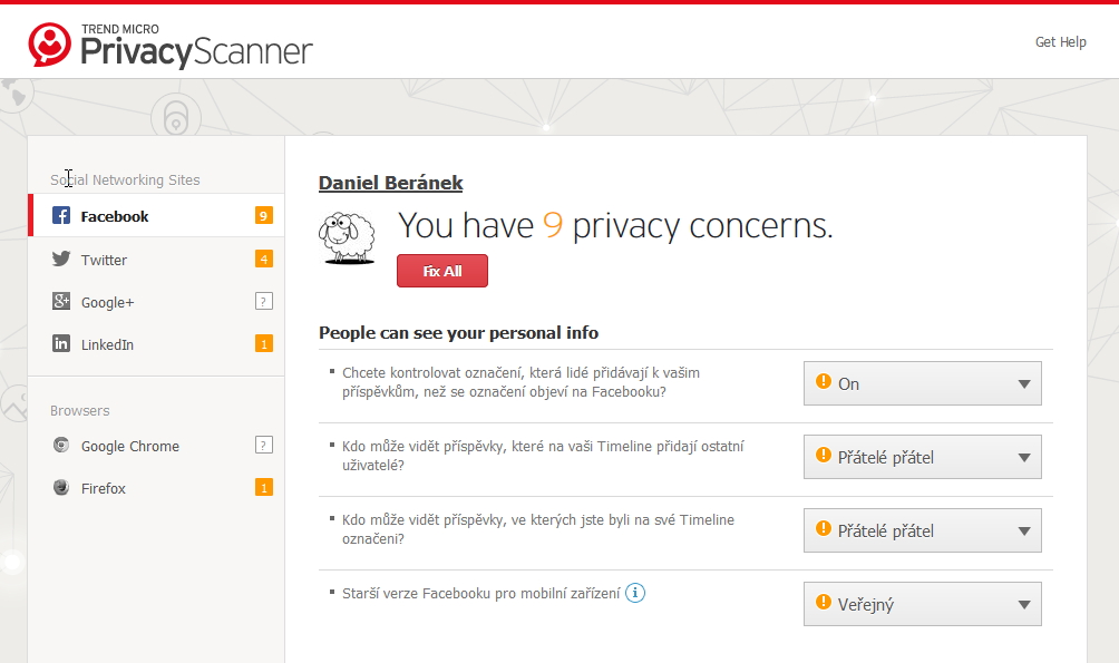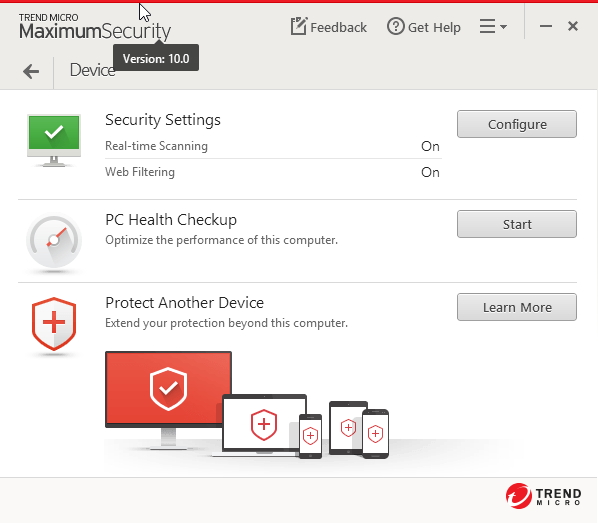 DevicePoložka Zařízení obsahuje nastavení antiviru včetně rezidentního štítu a ochrany webu. PC Health Checkup spuštěný odsud umožňuje krom základní optimalizace, provést v jednotlivých oblastech i volitelné zásahy (nalezení duplicit kvůli uvolnění místa, vyčištění dočasných souborů instant messengerů a přehrávačů médií, vymazání dalších položek ze seznamu aplikací spouštěných se startem Windows). A odkaz Protect Another Device směřuje ke stažení Trend Micro Maximum Security nejen pro další PC, ale i Mac, tablety a telefony s iOS i Androidem. PrivacyNástroje Soukromí zahrnují