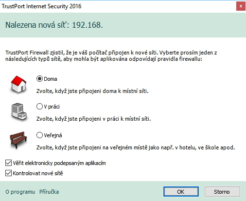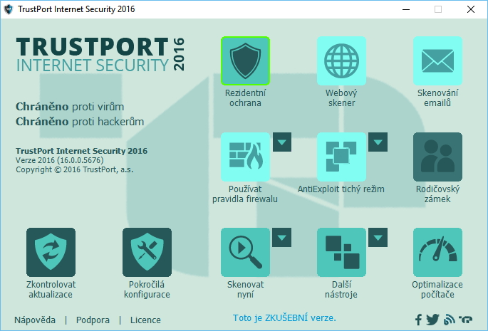 Pak už stačí počkat, až instalátor rozbalí, nainstaluje a zapíše program do systémových registrů (pár minut to trvá), a je možno používat - tedy až po restartu. Firewall TrustPortu hned identifikuje novou síť a vyžádá si určení profilu, dle kterého jí má spravovat. Zároveň okamžitě vyhledá a nainstaluje dostupné aktualizace databáze hrozeb i programu. Úvodní obrazovka nám dá nahlédnout do základních funkcí TrustPort Internet Security. Světlé či potmavlé ikony označují spuštěné a pozastavené funkce. Funkcionality s vícero volbami jsou doplněny šipečkou. Rezidentní ochranaRezidentní ochrana představuje neustále běžící ochranu souborového systému. Je spouštěna již při bootování systému a umožňuje nastavení, kdy nejsou spuštěny žádné uživatelské procesy, dokud ona sama neběží. Využívá skenování on-access (tj. při stažení souboru, jeho spuštění, spuštění jakéhokoliv procesu v systému, či jiného požadavku zahrnujícího systémové změny) a skenování on-demand - tedy skenování dle požadavků uživatele či časového plánu. Rezidentní ochranu pohání hned dva skenovací motory. Webový skenerWebový skener chrání uživatele při používání internetu. Monitoruje komunikaci přes HTTP protokol, stahuje soubory nejprve do sebe, kde jsou podrobeny kontrole, a teprve poté je předává cílové aplikaci (typicky prohlížeči). Skenování emailůMailový skener kontroluje poštovní komunikaci, identifikuje spam a brání infikaci počítače malwarem. Nabízí plnou integraci do poštovních klientů Microsoft Outlook, Mozilla Thunderbird, Outlook Express aj. FirewallFirewall monitoruje a spravuje síťovou komunikaci aplikací a systému. Obsahuje jednak webový antivirus, který chrání před phishingem a malwarem při surfování, jednak aplikačního inspektora, který je souborem pravidel pro monitorování a blokování komunikace aplikací. Je ho možno spustit ve 3 režimech: