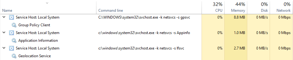 Adresní řádek Editoru registruPo dlouhých letech existence Editoru registru Microsoft konečně implementuje adresní řádek pro snadný přechod ke konkrétním klíčům registru. Do adresního řádku se dá rychle dostat pomocí dvojhmatu ALT + D. Větší vytěžování dostupné paměti na systémech s 3,5 a více GB RAMNa systémech s dostatkem paměti (tedy na většině novějšího železa) se ve Správci úloh objeví mnohem více procesů. Ty byly od Windows 2000 grupovány pod procesy svchost.exe. Windows 2000 ovšem pracovaly s minimem 64 MB a optimem od 256 MB RAM. Dnešní systémy běžně vybavené od 4 GB RAM výše již nevyužívají výhody takového grupování - naopak dle Microsoft je mnohem rozumnější je opět rozdělit a využívat výhod takového oddělení: