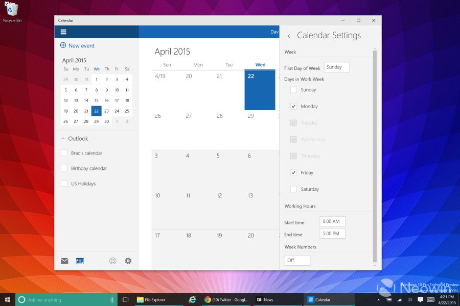Pošta a KalendářNovou podobu dostaly aplikace Pošta a Kalendář. Jsou přizpůsobeny třípanelovému zobrazení, email disponuje definovatelnými swipe gesty (umožňujícími mazat, přesouvat a označovat zprávy) a editačními schopnostmi Wordu. Můžete tak libovolně používat barvičky, ale i využít odrážky, vložit tabulky či obrázky. Přechod mezi mailem a kalendářem je usnadněn tlačítkem pro okamžité přepnutí. A obě aplikace podporují napojení na Office 365, Exchange, Outlook.com, Gmail, IMAP, POP aj. Nabídka Start, Hlavní panel a Oznamovací centrumDalšími pány na holení byly nabídka Start, Hlavní panel a Oznamovací centrum. Nové sestavení je nově uvádí i v barvě černého tématu. Nabídka Start již disponuje plnou přizpůsobitelností. Pokud rádi ladíte systémové barvy a zobrazení, můžete dané prvky prostředí systému nejen zprůhledňovat, ale také na ně aplikovat novou funkci AutoColor, která je barevně uzpůsobí pozadí plochy. Parciální vylepšení neminuly