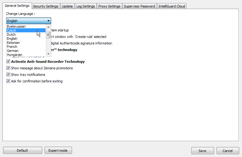 V horním menu najdeme krom nápovědy (pod jmenovkou Pomoc) a informací o programu veškerá Nastavení. V nich upřesníme jednak triviliálnější funkce typu podrobnost protokolů, zaheslování programu, nastavení proxy, způsoby aktualizace. Ale také zde můžeme nastavit, jak má Zemana interagovat s certifikovanými a necertifikovanými aplikacemi, a jak reagovat na pokusy daných aplikací při přístupu do registrů. Také právě zde můžeme povolit služby Anti-SSLLogger (ochraňující bezpečnostní vrstvu komunikace) a Anti-Sound Recorder (zabraňující v přístupu k nahrávání zvukového okolí počítače). Poslední nastavitelnou službou je IntelliGuard Cloud.