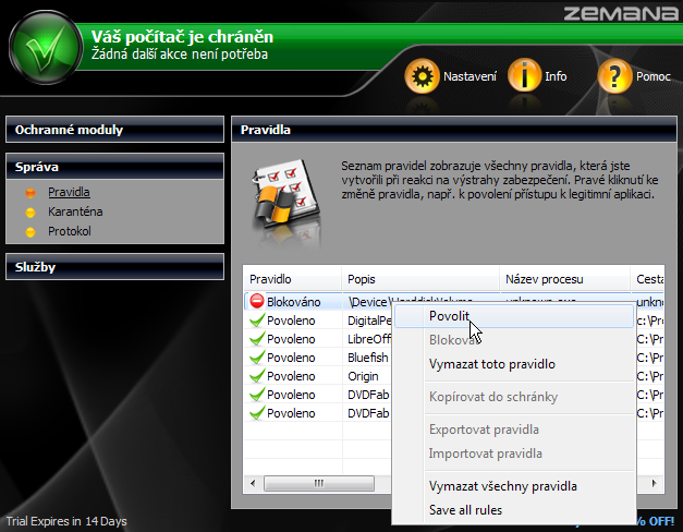 V Pravidlech se objevují výchozí způsoby chování Zemana AntiLoggeru k jednotlivým spouštěným aplikacím. Ty jsou ustanoveny při prvním spuštění daného programu pod dohledy Zemany. Pokud se nejedná o kýženou reakci, pravým myšítkem snadno pravidlo změníme, jak je vidět na obrázku, kde Zemana blokuje bezpečnostní software výrobce notebooku. V Karanténě jsou izolovány všechny podezřelé programy. Pomocí pravého myšítka lze určit, co s nimi. Protokol zaznamenává všechna automatická rozhodnutí o povolení či blokování aplikací a umožňuje jejich správu.