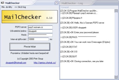 Tento program běží v systémové liště a po nastavené době zjistí stav zpráv na pop3 (mail) serveru. Byl-li doručen nový e-mail, program upozorní uživatele.