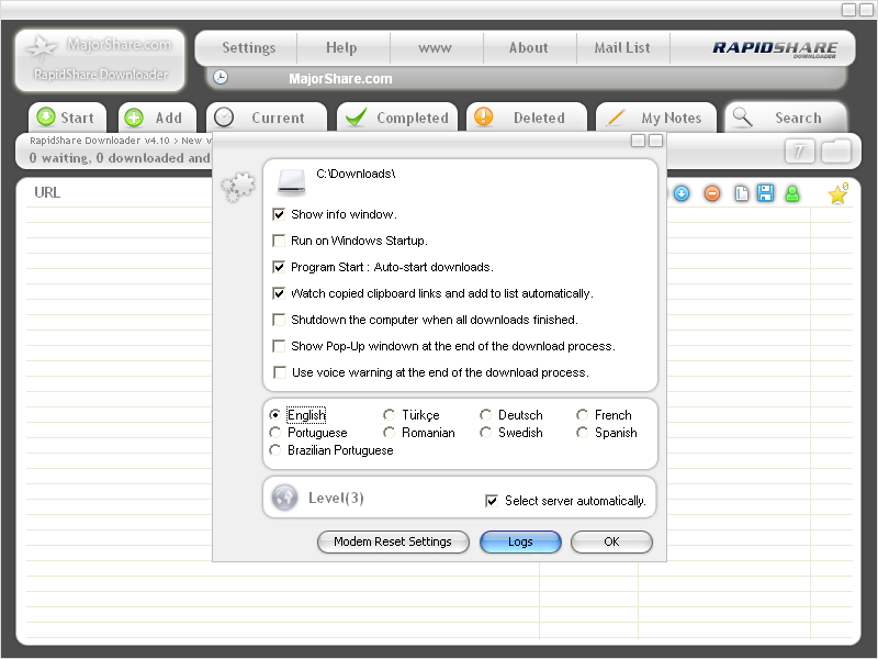 RapidShare Downloader je šikovný správce stahování, který umožňuje automatické stahování různých souborů z RapidShare.com. Snadno si vytvoříte seznam odkazů pro stažení - stačí zkopírovat a vložit odkazy do stahovače.