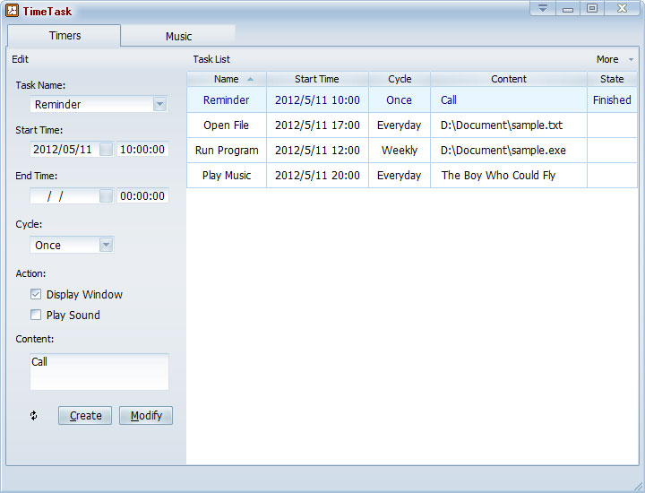 Maymeal TimeTask je plně vybavený, snadno ovladatelný časový nástroj používaný k vytvoření různých časových úkolů, jako je připomenutí, otevření dokumentu, spuštění programu, přehrání hudby, otevření webu, vypnutí atd. v určitou dobu. Lze nastavit samostatný, denní, týdenní, měsiční, roční a vlastní cyklus.