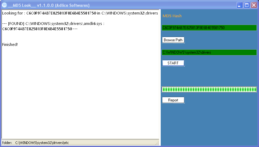 MD5Look je aplikace, která vyhledává soubory na základě MD5 hash kódu a konkrétního adresáře. Je zajištěna verifikaci MD5 kontrolního součtu, bohužel bez přístupu uživateli, jde o část jádra aplikace. Část okna je vyhrazená pro zobrazování logu aktualizovaného v reálném čase.
