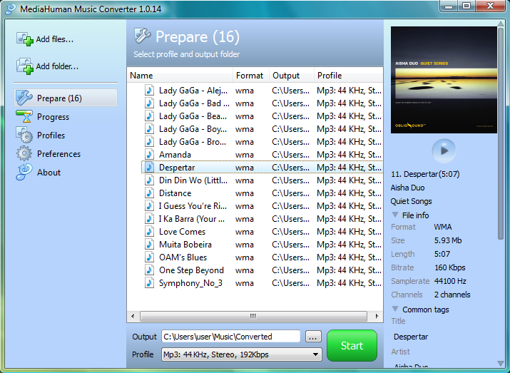 MediaHuman Music Converter je software vyvinutý pro převod hudebních skladeb (WMA, M4B, M4P) na nejčastěji používané formáty, jako jsou MP3, OGG, WAV. Je to velmi užitečné zejména v případě, pokud máte skladby zakoupené v on-line hudebním obchodě a chcete si ji poslechnout na zařízení pro přehrávání, které nepodporují jeho formát. Proces konverze vaší hudby je velmi jednoduchý: spustit program, vybrat požadovaný výstupní formát a výstupní složku a stisknout tlačítko "Start". Podpora dávkové konverze.