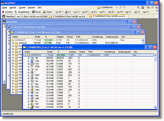 MeinPlatz je jednoduchý způsob pro zjištění místa na disku, jeho využitém prostoru a zobrazení informací o složkách a souborech. Snadno a rychle disk proskenuje a zobrazí výsledky, které lze exportovat do XLS, HTM, CSV a TXT. Možnost tisku s náhledem.